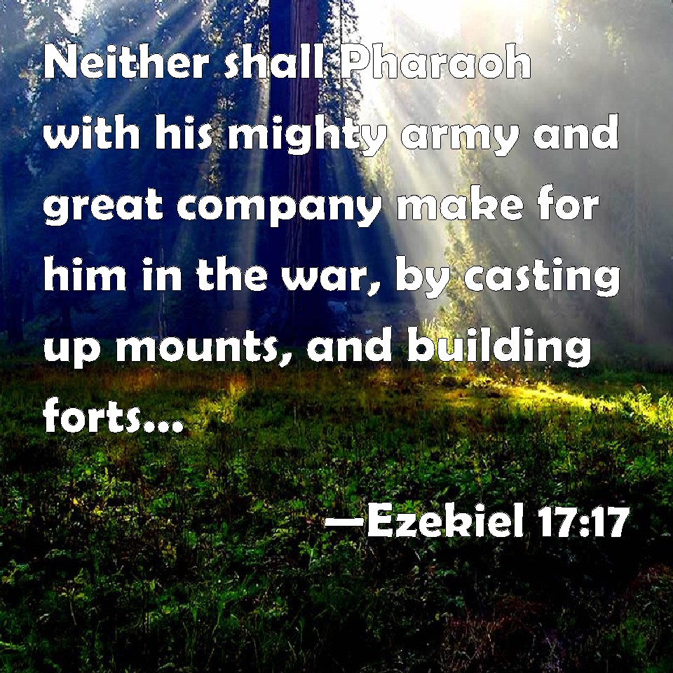 Choose a Background Ezekiel 17:17 Neither shall Pharaoh with his mighty army and great company make for him in the war, by casting up mounts, and building forts, to cut off many persons: KJV: Neither shall Pharaoh with his mighty army and great company make for him in the war, by casting up mounts, and building forts, to cut off many persons: DRB: And not with a great army, nor with much people shall Pharao fight against him: when he shall cast up mounts, and build forts, to cut off many souls. DBT: Neither shall Pharaoh with a mighty army and a great assemblage do anything for him in the war, when they cast up mounds and build forts to cut off many persons. ERV: Neither shall Pharaoh with his mighty army and great company make for him in the war, when they cast up mounts and build forts, to cut off many persons. WBT: Neither shall Pharaoh with his mighty army and great company make for him in the war, by casting up mounts, and building forts, to cut off many persons: WEB: Neither shall Pharaoh with his mighty army and great company help him in the war, when they cast up mounds and build forts, to cut off many persons. YLT: And not with a great force, and with a numerous assembly, Doth Pharaoh maintain him in battle, By pouring out a mount, and in building a fortification, To cut off many souls.Links Ezekiel 17:17 NIV • Ezekiel 17:17 NLT • Ezekiel 17:17 ESV • Ezekiel 17:17 NASB • Ezekiel 17:17 KJV • Ezekiel 17:17 Interlinear • Ezekiel 17:17 Commentaries • Ezekiel 17:17 Parallel Texts • Ezekiel 17:17 Bible Apps • Ezekiel 17:17 Parallel • Bible Hub |