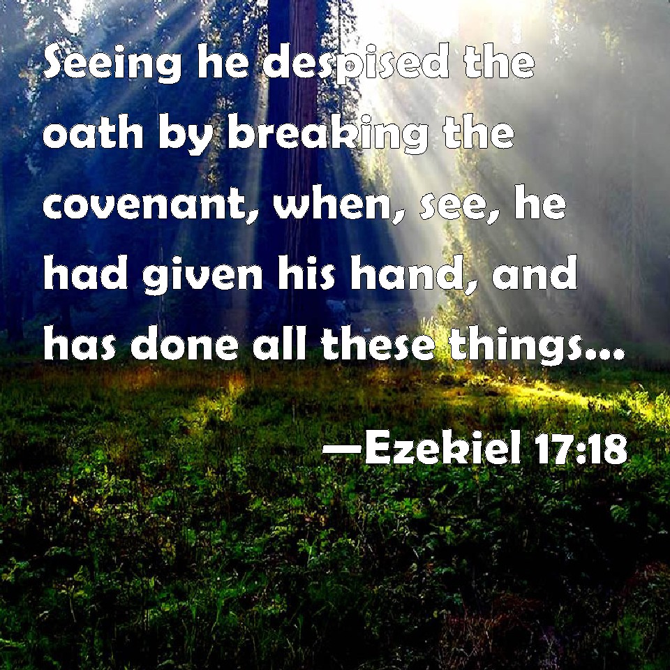 Choose a Background Ezekiel 17:18 Seeing he despised the oath by breaking the covenant, when, see, he had given his hand, and has done all these things, he shall not escape. KJV: Seeing he despised the oath by breaking the covenant, when, lo, he had given his hand, and hath done all these things, he shall not escape. DRB: For he had despised the oath, breaking his covenant, and behold he hath given his hand: and having done all these things, he shall not escape. DBT: He despised the oath, and broke the covenant; and behold, he had given his hand, yet hath he done all these things: he shall not escape. ERV: For he hath despised the oath by breaking the covenant; and behold, he had given his hand, and yet hath done all these things; he shall not escape. WBT: Seeing he despised the oath by breaking the covenant, when lo, he had given his hand, and hath done all these things, he shall not escape. WEB: For he has despised the oath by breaking the covenant; and behold, he had given his hand, and yet has done all these things; he shall not escape. YLT: And he despised the oath — to break covenant, And lo, he hath given his hand, And all these he hath done, he escapeth not.Links Ezekiel 17:18 NIV • Ezekiel 17:18 NLT • Ezekiel 17:18 ESV • Ezekiel 17:18 NASB • Ezekiel 17:18 KJV • Ezekiel 17:18 Interlinear • Ezekiel 17:18 Commentaries • Ezekiel 17:18 Parallel Texts • Ezekiel 17:18 Bible Apps • Ezekiel 17:18 Parallel • Bible Hub |