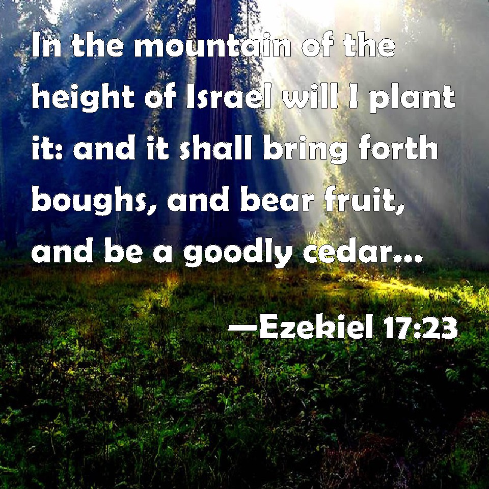 Choose a Background Ezekiel 17:23 In the mountain of the height of Israel will I plant it: and it shall bring forth boughs, and bear fruit, and be a goodly cedar: and under it shall dwell all fowl of every wing; in the shadow of the branches thereof shall they dwell. KJV: In the mountain of the height of Israel will I plant it: and it shall bring forth boughs, and bear fruit, and be a goodly cedar: and under it shall dwell all fowl of every wing; in the shadow of the branches thereof shall they dwell. DRB: On the high mountains of Israel will I plant it, and it shall shoot forth into branches, and shall bear fruit, and it shall become a great cedar: and all birds shall dwell under it, and every fowl shall make its nest under the shadow of the branches thereof. DBT: upon the mountain of the height of Israel will I plant it; and it shall bring forth branches, and bear fruit, and become a noble cedar; and under it shall dwell all birds of every wing; in the shadow of the branches thereof shall they dwell. ERV: in the mountain of the height of Israel will I plant it: and it shall bring forth boughs, and bear fruit, and be a goodly cedar: and under it shall dwell all fowl of every wing; in the shadow of the branches thereof shall they dwell. WBT: In the mountain of the hight of Israel will I plant it: and it shall bring forth boughs, and bear fruit, and be a goodly cedar: and under it shall dwell all fowl of every wing; in the shade of its branches shall they dwell. WEB: in the mountain of the height of Israel will I plant it; and it shall bring forth boughs, and bear fruit, and be a goodly cedar: and under it shall dwell all birds of every wing; in the shade of its branches shall they dwell. YLT: In a mountain — the high place of Israel, I plant it, And it hath borne boughs, and yielded fruit, And become a goodly cedar, And dwelt under it have all birds of every wing, In the shade of its thin shoots they dwell.Links Ezekiel 17:23 NIV • Ezekiel 17:23 NLT • Ezekiel 17:23 ESV • Ezekiel 17:23 NASB • Ezekiel 17:23 KJV • Ezekiel 17:23 Interlinear • Ezekiel 17:23 Commentaries • Ezekiel 17:23 Parallel Texts • Ezekiel 17:23 Bible Apps • Ezekiel 17:23 Parallel • Bible Hub |