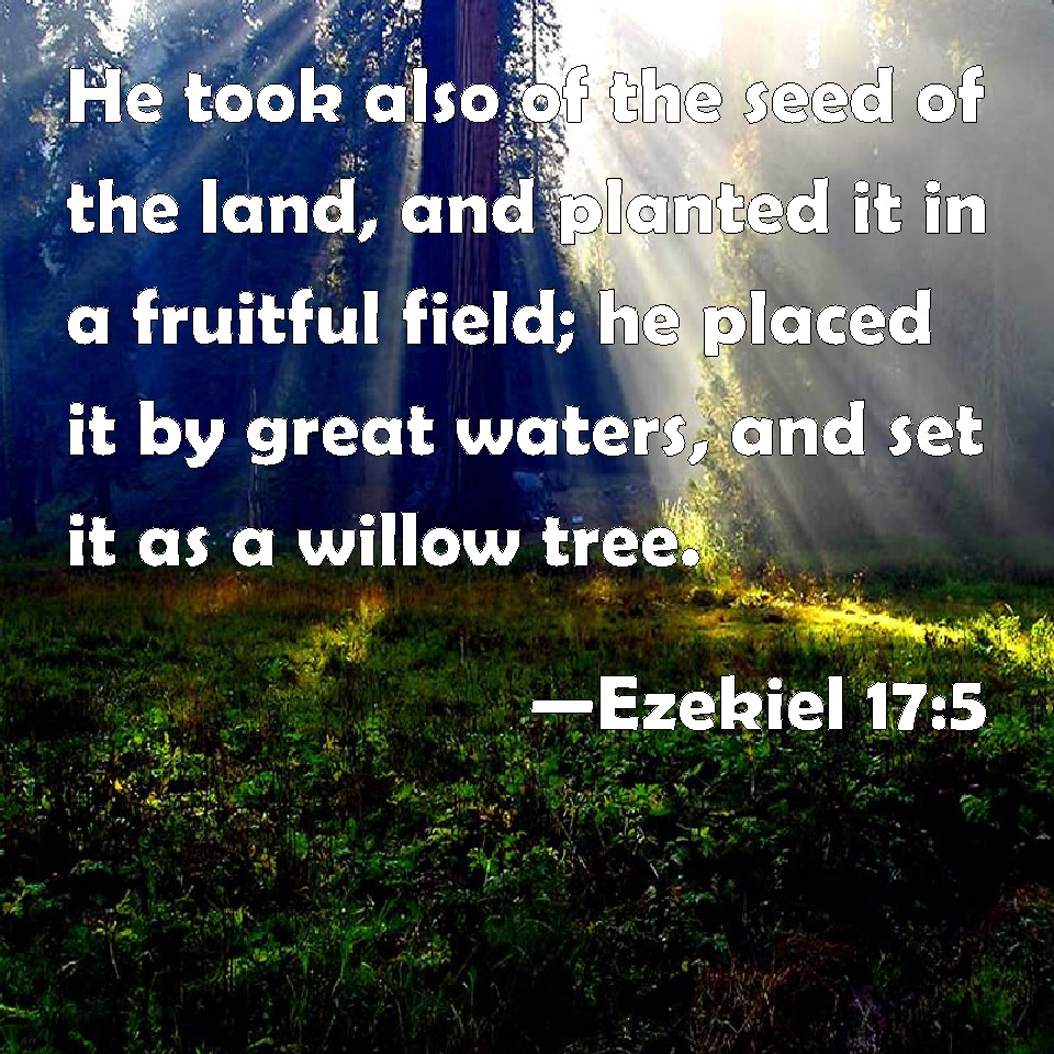 Choose a Background Ezekiel 17:5 He took also of the seed of the land, and planted it in a fruitful field; he placed it by great waters, and set it as a willow tree. KJV: He took also of the seed of the land, and planted it in a fruitful field; he placed it by great waters, and set it as a willow tree. DRB: And he took of the seed of the land, and put it in the ground for seed, that it might take a firm root over many waters: he planted it on the surface of the earth. DBT: And he took of the seed of the land, and planted it in a fruitful field; he placed it by great waters, he set it as a willow tree. ERV: He took also of the seed of the land, and planted it in a fruitful soil; he placed it beside many waters; he set it as a willow tree. WBT: He took also of the seed of the land, and planted it in a fruitful field; he placed it by great waters, and set it as a willow tree. WEB: He took also of the seed of the land, and planted it in a fruitful soil; he placed it beside many waters; he set it as a willow tree. YLT: And it taketh of the seed of the land, And doth put it in a field of seed, To take by many waters, In a conspicuous place it hath set it.Links Ezekiel 17:5 NIV • Ezekiel 17:5 NLT • Ezekiel 17:5 ESV • Ezekiel 17:5 NASB • Ezekiel 17:5 KJV • Ezekiel 17:5 Interlinear • Ezekiel 17:5 Commentaries • Ezekiel 17:5 Parallel Texts • Ezekiel 17:5 Bible Apps • Ezekiel 17:5 Parallel • Bible Hub |