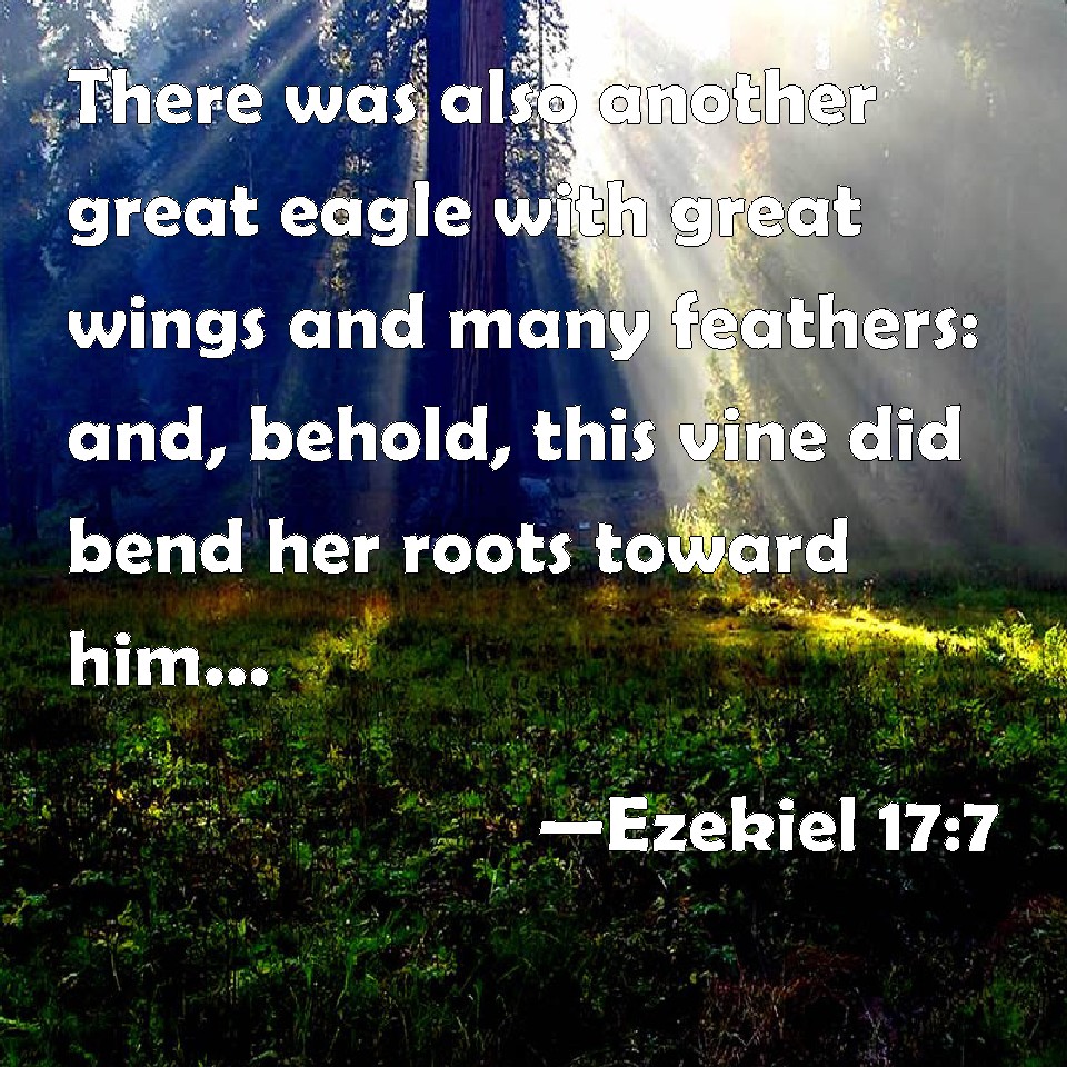Choose a Background Ezekiel 17:7 There was also another great eagle with great wings and many feathers: and, behold, this vine did bend her roots toward him, and shot forth her branches toward him, that he might water it by the furrows of her plantation. KJV: There was also another great eagle with great wings and many feathers: and, behold, this vine did bend her roots toward him, and shot forth her branches toward him, that he might water it by the furrows of her plantation. DRB: And there was another large eagle, with great wings, and many feathers: and behold this vine, bending as it were her roots towards him, stretched forth her branches to him, that he might water it by the furrows of her plantation. DBT: And there was another great eagle with great wings and many feathers; and behold, from the beds of her plantation, this vine did bend her roots unto him, and shot forth her branches toward him, that he might water it. ERV: There was also another great eagle with great wings and many feathers: and, behold, this vine did bend its roots toward him, and shot forth its branches toward him, from the beds of its plantation, that he might water it. WBT: There was also another great eagle with great wings and many feathers: and behold, this vine did bend her roots towards him, and shot forth her branches towards him, that he might water it by the furrows of her plantation. WEB: There was also another great eagle with great wings and many feathers: and behold, this vine did bend its roots toward him, and shot forth its branches toward him, from the beds of its plantation, that he might water it. YLT: And there is another great eagle, Great-winged, and abounding with feathers, And lo, this vine hath bent its roots toward him, And its thin shoots it hath sent out toward him, To water it from the furrows of its planting,Links Ezekiel 17:7 NIV • Ezekiel 17:7 NLT • Ezekiel 17:7 ESV • Ezekiel 17:7 NASB • Ezekiel 17:7 KJV • Ezekiel 17:7 Interlinear • Ezekiel 17:7 Commentaries • Ezekiel 17:7 Parallel Texts • Ezekiel 17:7 Bible Apps • Ezekiel 17:7 Parallel • Bible Hub |