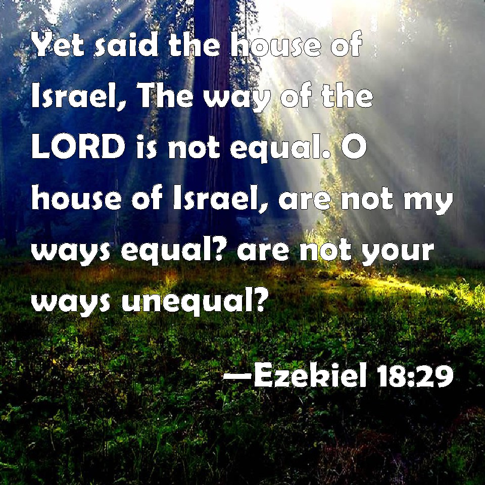Choose a Background Ezekiel 18:29 Yet said the house of Israel, The way of the LORD is not equal. O house of Israel, are not my ways equal? are not your ways unequal? KJV: Yet saith the house of Israel, The way of the Lord is not equal. O house of Israel, are not my ways equal? are not your ways unequal? DRB: And the children of Israel say: The way of the Lord is not right. Are not my ways right, O house of Israel, and are not rather your ways perverse? DBT: But the house of Israel say, The way of the Lord is not equal. O house of Israel, are not my ways equal? Is it not your ways that are unequal? ERV: Yet saith the house of Israel, The way of the Lord is not equal. O house of Israel, are not my ways equal? are not your ways unequal? WBT: Yet saith the house of Israel, The way of the Lord is not equal. O house of Israel, are not my ways equal? are not your ways unequal? WEB: Yet says the house of Israel, The way of the Lord is not equal. house of Israel, are not my ways equal? Aren't your ways unequal? YLT: And the house of Israel have said, Not pondered is the way of the Lord, My ways — are they not pondered? O house of Israel — are not your ways unpondered?Links Ezekiel 18:29 NIV • Ezekiel 18:29 NLT • Ezekiel 18:29 ESV • Ezekiel 18:29 NASB • Ezekiel 18:29 KJV • Ezekiel 18:29 Interlinear • Ezekiel 18:29 Commentaries • Ezekiel 18:29 Parallel Texts • Ezekiel 18:29 Bible Apps • Ezekiel 18:29 Parallel • Bible Hub |
