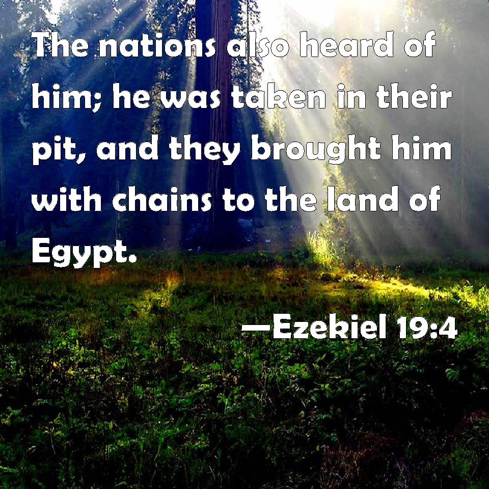 Ezekiel 19:4 The nations also heard of him; he was taken in their pit, and they brought him with chains to the land of Egypt.