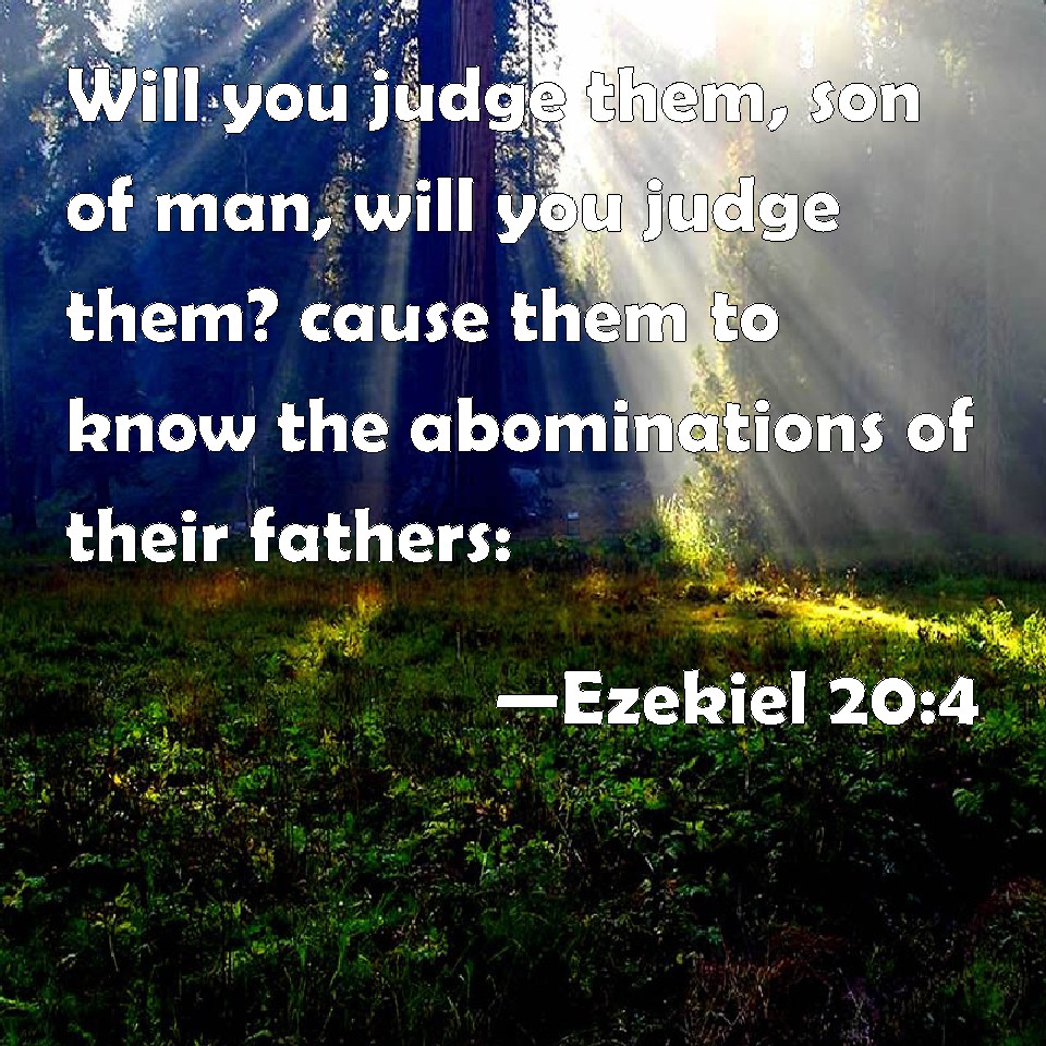 Choose a Background Ezekiel 20:4 Will you judge them, son of man, will you judge them? cause them to know the abominations of their fathers: KJV: Wilt thou judge them, son of man, wilt thou judge them? cause them to know the abominations of their fathers: DRB: If thou judgest them, if thou judgest, son of man, declare to them the abominations of their fathers. DBT: Wilt thou judge them, wilt thou judge, son of man? Cause them to know the abominations of their fathers, ERV: Wilt thou judge them, son of man, wilt thou judge them? Cause them to know the abominations of their fathers; WBT: Wilt thou judge them, son of man, wilt thou judge them? cause them to know the abominations of their fathers: WEB: Will you judge them, son of man, will you judge them? Cause them to know the abominations of their fathers; YLT: Dost thou judge them? Dost thou judge, son of man? The abominations of their fathers cause them to know,Links Ezekiel 20:4 NIV • Ezekiel 20:4 NLT • Ezekiel 20:4 ESV • Ezekiel 20:4 NASB • Ezekiel 20:4 KJV • Ezekiel 20:4 Interlinear • Ezekiel 20:4 Commentaries • Ezekiel 20:4 Parallel Texts • Ezekiel 20:4 Bible Apps • Ezekiel 20:4 Parallel • Bible Hub |