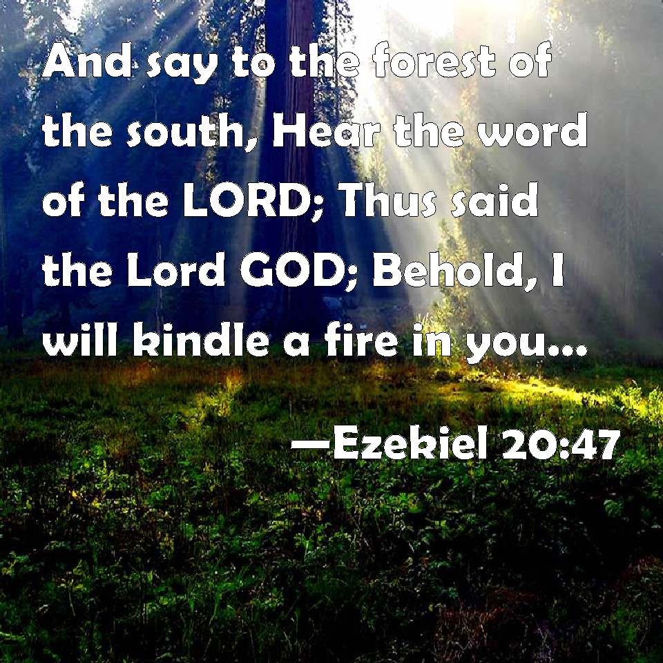 Choose a Background Ezekiel 20:47 And say to the forest of the south, Hear the word of the LORD; Thus said the Lord GOD; Behold, I will kindle a fire in you, and it shall devour every green tree in you, and every dry tree: the flaming flame shall not be quenched, and all faces from the south to the north shall be burned therein. KJV: And say to the forest of the south, Hear the word of the LORD; Thus saith the Lord GOD; Behold, I will kindle a fire in thee, and it shall devour every green tree in thee, and every dry tree: the flaming flame shall not be quenched, and all faces from the south to the north shall be burned therein. DRB: And any to the south forest: Hear the word of the Lord: Thus saith the Lord God: Behold I will kindle a fire in thee, and will burn in thee every green tree, and every dry tree: the dame of the fire shall not be quenched: and every face shall be burned in it, from the south even to the north. DBT: and say to the forest of the south, Hear the word of Jehovah. Thus saith the Lord Jehovah: Behold, I will kindle a fire in thee, and it shall devour every green tree in thee, and every dry tree: the flashing flame shall not be quenched; and all that it meets from the south to the north shall be burned thereby. ERV: and say to the forest of the South, Hear the word of the LORD; Thus saith the Lord GOD: Behold, I will kindle a fire in thee, and it shall devour every green tree in thee, and every dry tree: the flaming flame shall not be quenched, and all faces from the south to the north shall be burnt thereby. WBT: And say to the forest of the south, Hear the word of the LORD; Thus saith the Lord GOD; Behold, I will kindle a fire in thee, and it shall devour every green tree in thee, and every dry tree: the flaming flame shall not be quenched, and all faces from the south to the north shall be burned therein. WEB: and tell the forest of the South, Hear the word of Yahweh: Thus says the Lord Yahweh, Behold, I will kindle a fire in you, and it shall devour every green tree in you, and every dry tree: the flaming flame shall not be quenched, and all faces from the south to the north shall be burnt thereby. YLT: and thou hast said to the forest of the south: Hear a word of Jehovah: Thus said the Lord Jehovah: Lo, I am kindling in thee a fire, And it hath devoured in thee every moist tree, and every dry tree, Not quenched is the glowing flames, And burnt by it have been all faces from south to north.Links Ezekiel 20:47 NIV • Ezekiel 20:47 NLT • Ezekiel 20:47 ESV • Ezekiel 20:47 NASB • Ezekiel 20:47 KJV • Ezekiel 20:47 Interlinear • Ezekiel 20:47 Commentaries • Ezekiel 20:47 Parallel Texts • Ezekiel 20:47 Bible Apps • Ezekiel 20:47 Parallel • Bible Hub |
