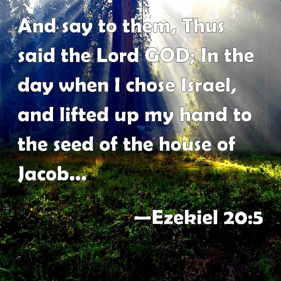 Choose a Background Ezekiel 20:5 And say to them, Thus said the Lord GOD; In the day when I chose Israel, and lifted up my hand to the seed of the house of Jacob, and made myself known to them in the land of Egypt, when I lifted up my hand to them, saying, I am the LORD your God; KJV: And say unto them, Thus saith the Lord GOD; In the day when I chose Israel, and lifted up mine hand unto the seed of the house of Jacob, and made myself known unto them in the land of Egypt, when I lifted up mine hand unto them, saying, I am the LORD your God; DRB: And say to them: Thus saith the Lord God : In the day when I chose Israel, and lifted up my hand for the race of the house of Jacob: and appeared to them in the land of Egypt, and lifted up my hand for them, saying: I am the Lord your God: DBT: and say unto them, Thus saith the Lord Jehovah: In the day when I chose Israel, and lifted up my hand unto the seed of the house of Jacob, and made myself known unto them in the land of Egypt, when I lifted up my hand unto them, saying, I am Jehovah your God, ERV: and say unto them, Thus saith the Lord GOD: In the day when I chose Israel, and lifted up mine hand unto the seed of the house of Jacob, and made myself known unto them in the land of Egypt, when I lifted up mine hand unto them, Saying, I am the LORD your God; WBT: And say to them, Thus saith the Lord GOD; In the day when I chose Israel, and lifted up my hand to the seed of the house of Jacob, and made myself known to them in the land of Egypt, when I lifted up my hand to them, saying, I am the LORD your God; WEB: and tell them, Thus says the Lord Yahweh: In the day when I chose Israel, and swore to the seed of the house of Jacob, and made myself known to them in the land of Egypt, when I swore to them, saying, I am Yahweh your God; YLT: and thou hast said unto them: Thus said the Lord Jehovah: In the day of My fixing on Israel, I lift up My hand, To the seed of the house of Jacob, And am known to them in the land of Egypt, And I lift up My hand to them, Saying, I am Jehovah your God.Links Ezekiel 20:5 NIV • Ezekiel 20:5 NLT • Ezekiel 20:5 ESV • Ezekiel 20:5 NASB • Ezekiel 20:5 KJV • Ezekiel 20:5 Interlinear • Ezekiel 20:5 Commentaries • Ezekiel 20:5 Parallel Texts • Ezekiel 20:5 Bible Apps • Ezekiel 20:5 Parallel • Bible Hub |