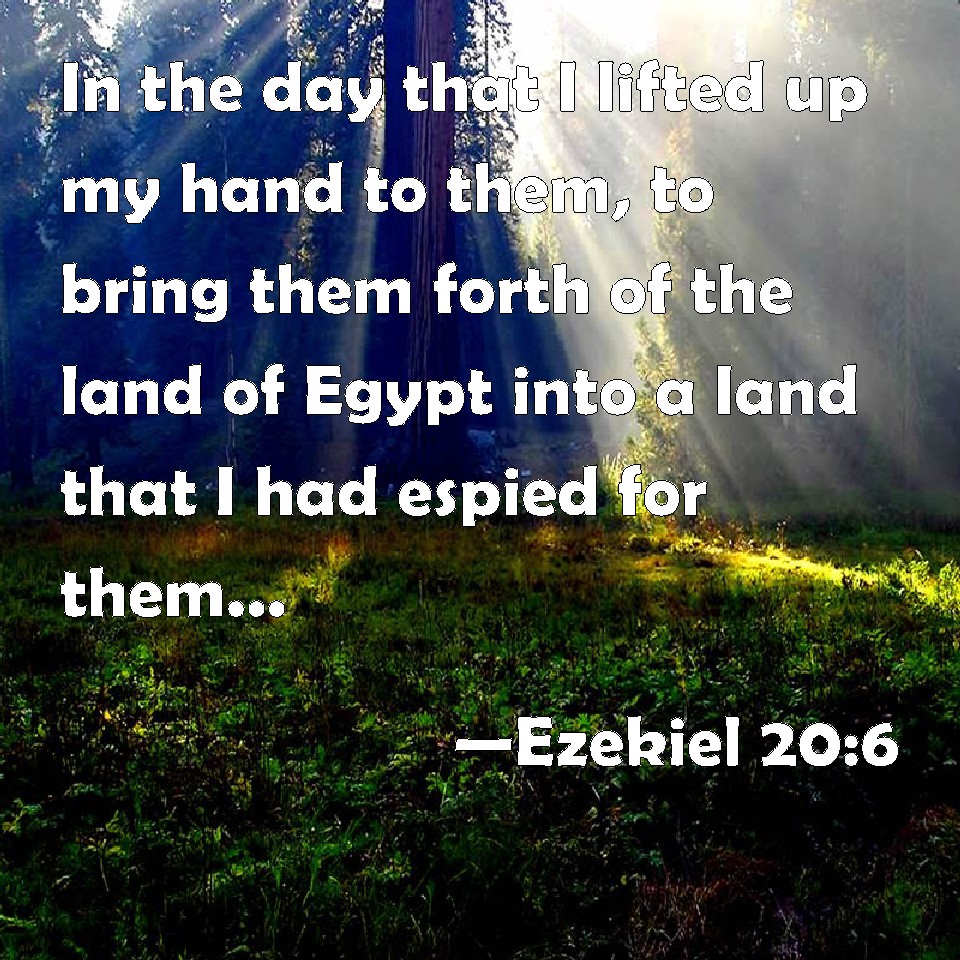 Choose a Background Ezekiel 20:6 In the day that I lifted up my hand to them, to bring them forth of the land of Egypt into a land that I had espied for them, flowing with milk and honey, which is the glory of all lands: KJV: In the day that I lifted up mine hand unto them, to bring them forth of the land of Egypt into a land that I had espied for them, flowing with milk and honey, which is the glory of all lands: DRB: In that day I lifted up my hand for them, to bring them out of the land of Egypt, into a land which I had provided for them, flowing with milk and honey, which excelleth amongst all lands. DBT: in that day I lifted up my hand unto them, to bring them out of the land of Egypt into a land that I had espied for them, flowing with milk and honey, which is the ornament of all lands; ERV: in that day I lifted up mine hand unto them, to bring them forth out of the land of Egypt into a land that I had espied for them, flowing with milk and honey, which is the glory of all lands: WBT: In the day that I lifted up my hand to them, to bring them forth from the land of Egypt into a land that I had espied for them, flowing with milk and honey, which is the glory of all lands: WEB: in that day I swore to them, to bring them forth out of the land of Egypt into a land that I had searched out for them, flowing with milk and honey, which is the glory of all lands. YLT: In that day I did lift up My hand to them, To bring them forth from the land of Egypt, Unto a land that I spied out for them, Flowing with milk and honey, A beauty it is to all the lands,Links Ezekiel 20:6 NIV • Ezekiel 20:6 NLT • Ezekiel 20:6 ESV • Ezekiel 20:6 NASB • Ezekiel 20:6 KJV • Ezekiel 20:6 Interlinear • Ezekiel 20:6 Commentaries • Ezekiel 20:6 Parallel Texts • Ezekiel 20:6 Bible Apps • Ezekiel 20:6 Parallel • Bible Hub |