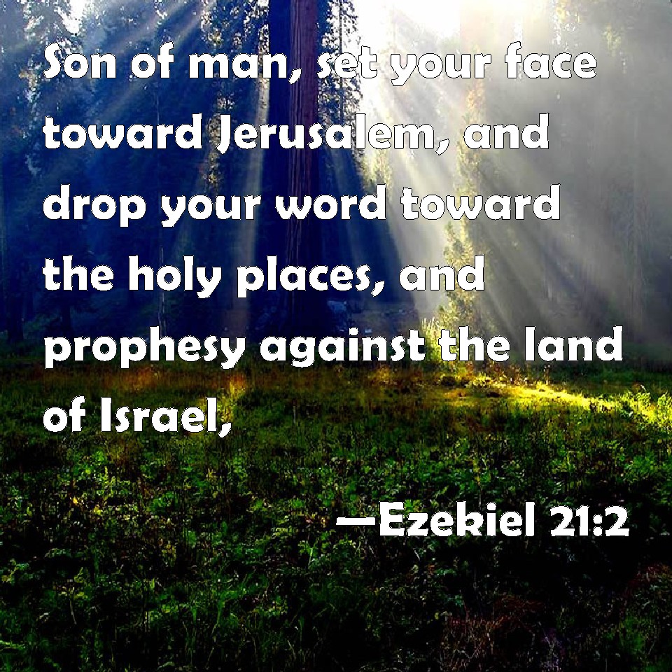 Choose a Background Ezekiel 21:2 Son of man, set your face toward Jerusalem, and drop your word toward the holy places, and prophesy against the land of Israel, KJV: Son of man, set thy face toward Jerusalem, and drop thy word toward the holy places, and prophesy against the land of Israel, DRB: Son of man, set thy face toward Jerusalem, and let thy speech flow towards the holy places, and prophesy against the land of Israel: DBT: Son of man, set thy face against Jerusalem, and drop words against the holy places, and prophesy against the land of Israel, ERV: Son of man, set thy face toward Jerusalem, and drop thy word toward the sanctuaries, and prophesy against the land of Israel; WBT: Son of man, set thy face towards Jerusalem, and drop thy word towards the holy places, and prophesy against the land of Israel, WEB: Son of man, set your face toward Jerusalem, and drop [your word] toward the sanctuaries, and prophesy against the land of Israel; YLT: 'Son of man, set thy face unto Jerusalem, and prophesy unto the holy places, and prophesy unto the ground of Israel;Links Ezekiel 21:2 NIV • Ezekiel 21:2 NLT • Ezekiel 21:2 ESV • Ezekiel 21:2 NASB • Ezekiel 21:2 KJV • Ezekiel 21:2 Interlinear • Ezekiel 21:2 Commentaries • Ezekiel 21:2 Parallel Texts • Ezekiel 21:2 Bible Apps • Ezekiel 21:2 Parallel • Bible Hub |
