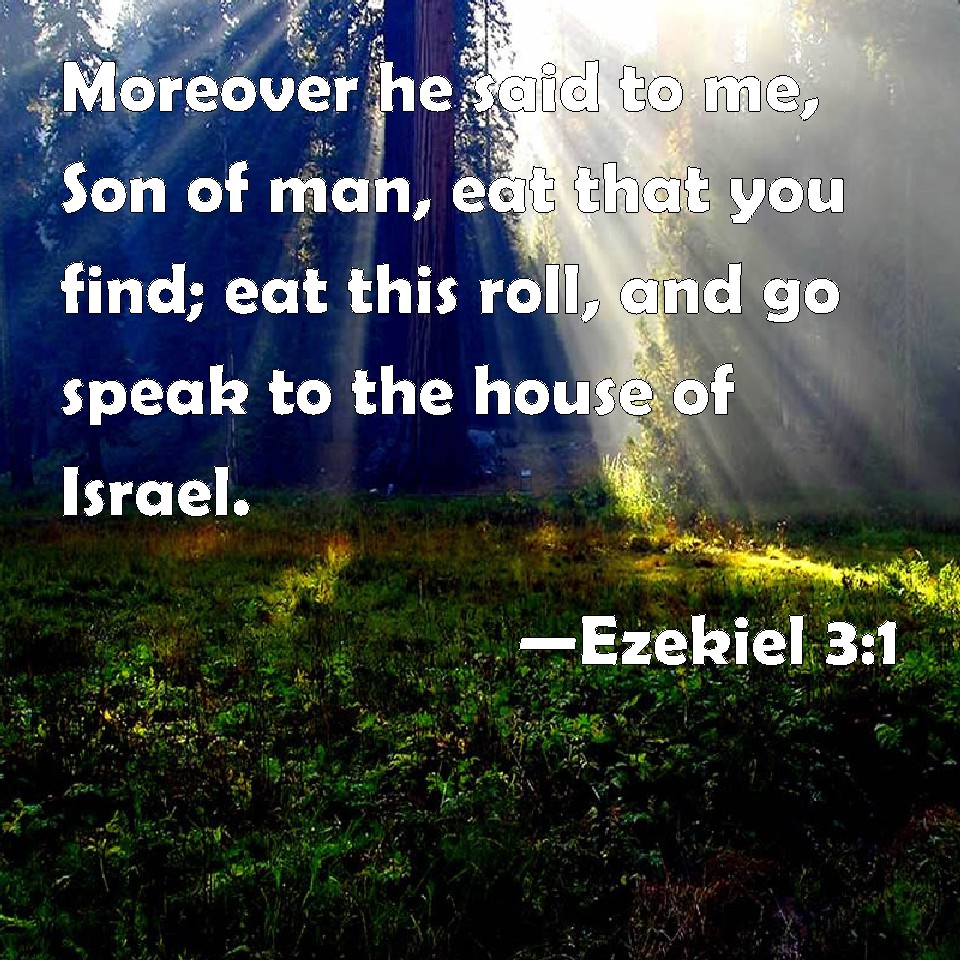 Choose a Background Ezekiel 3:1 Moreover he said to me, Son of man, eat that you find; eat this roll, and go speak to the house of Israel. KJV: Moreover he said unto me, Son of man, eat that thou findest; eat this roll, and go speak unto the house of Israel. DRB: And he said to me: Son of man, eat all that thou shalt find: eat this book, and go speak to the children of Israel. DBT: And he said unto me, Son of man, eat what thou findest; eat this roll, and go, speak unto the house of Israel. ERV: And he said unto me, Son of man, eat that thou findest; eat this roll, and go, speak unto the house of Israel. WBT: Moreover he said to me, Son of man, eat what thou findest; eat this roll, and go, speak to the house of Israel. WEB: He said to me, Son of man, eat that which you find. Eat this scroll, and go, speak to the house of Israel. YLT: And He saith unto me, 'Son of man, that which thou findest eat, eat this roll, and go, speak unto the house of Israel.'Links Ezekiel 3:1 NIV • Ezekiel 3:1 NLT • Ezekiel 3:1 ESV • Ezekiel 3:1 NASB • Ezekiel 3:1 KJV • Ezekiel 3:1 Interlinear • Ezekiel 3:1 Commentaries • Ezekiel 3:1 Parallel Texts • Ezekiel 3:1 Bible Apps • Ezekiel 3:1 Parallel • Bible Hub |