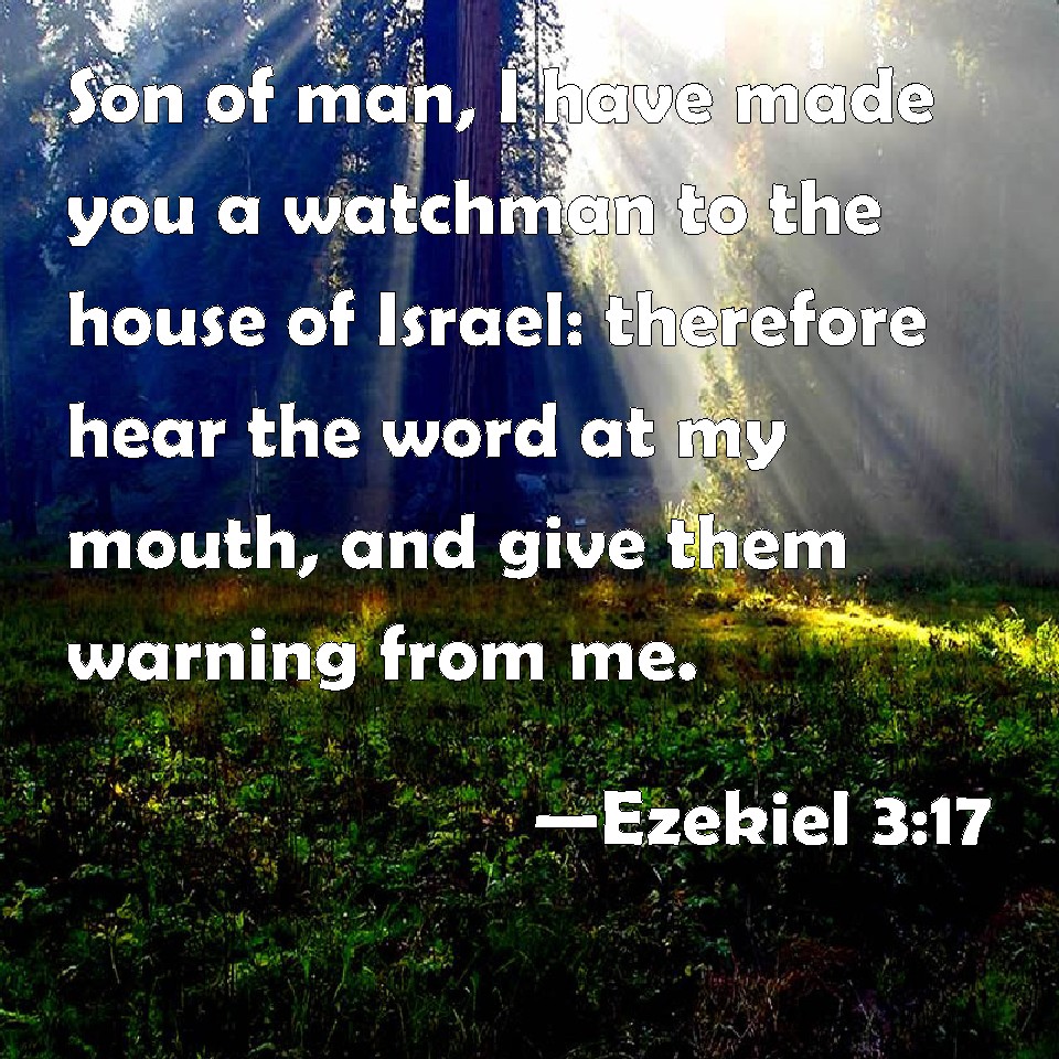 Choose a Background Ezekiel 3:17 Son of man, I have made you a watchman to the house of Israel: therefore hear the word at my mouth, and give them warning from me. KJV: Son of man, I have made thee a watchman unto the house of Israel: therefore hear the word at my mouth, and give them warning from me. DRB: Son of man, I have made thee a watchman to the house of Israel: and thou shalt hear the word out of my mouth, and shalt tell it them from me. DBT: Son of man, I have appointed thee a watchman unto the house of Israel, and thou shalt hear the word from my mouth, and give them warning from me. ERV: Son of man, I have made thee a watchman unto the house of Israel: therefore hear the word at my mouth, and give them warning from me. WBT: Son of man, I have made thee a watchman to the house of Israel: therefore hear the word at my mouth, and give them warning from me. WEB: Son of man, I have made you a watchman to the house of Israel: therefore hear the word from my mouth, and give them warning from me. YLT: that there is a word of Jehovah unto me, saying, 'Son of man, a watchman I have given thee to the house of Israel, and thou hast heard from My mouth a word, and hast warned them from Me.Links Ezekiel 3:17 NIV • Ezekiel 3:17 NLT • Ezekiel 3:17 ESV • Ezekiel 3:17 NASB • Ezekiel 3:17 KJV • Ezekiel 3:17 Interlinear • Ezekiel 3:17 Commentaries • Ezekiel 3:17 Parallel Texts • Ezekiel 3:17 Bible Apps • Ezekiel 3:17 Parallel • Bible Hub |