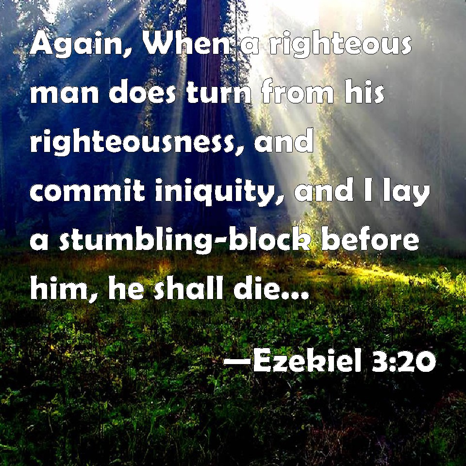 Choose a Background Ezekiel 3:20 Again, When a righteous man does turn from his righteousness, and commit iniquity, and I lay a stumbling-block before him, he shall die: because you have not given him warning, he shall die in his sin, and his righteousness which he has done shall not be remembered; but his blood will I require at your hand. KJV: Again, When a righteous man doth turn from his righteousness, and commit iniquity, and I lay a stumblingblock before him, he shall die: because thou hast not given him warning, he shall die in his sin, and his righteousness which he hath done shall not be remembered; but his blood will I require at thine hand. DRB: Moreover if the just man shall turn away from his justice, and shall commit iniquity: I will lay a stumblingblock before him, he shall die, because thou hast not given him warning: he shall die in his sin, and his justices which he hath done, shall not be remembered: but I will require his blood at thy hand. DBT: And when a righteous man doth turn from his righteousness, and do what is wrong, and I lay a stumbling-block before him, he shall die; because thou hast not given him warning, he shall die in his sin, and his righteous acts which he hath done shall not be remembered; but his blood will I require at thy hand. ERV: Again, when a righteous man doth turn from his righteousness, and commit iniquity, and I lay a stumblingblock before him, he shall die: because thou hast not given him warning, he shall die in his sin, and his righteous deeds which he hath done shall not be remembered; but his blood will I require at thine hand. WBT: Again, When a righteous man doth turn from his righteousness, and commit iniquity, and I lay a stumbling-block before him, he shall die: because thou hast not given him warning, he shall die in his sin, and his righteousness which he hath done shall not be remembered; but his blood will I require at thy hand. WEB: Again, when a righteous man does turn from his righteousness, and commit iniquity, and I lay a stumbling block before him, he shall die: because you have not given him warning, he shall die in his sin, and his righteous deeds which he has done shall not be remembered; but his blood will I require at your hand. YLT: 'And in the turning back of the righteous from his righteousness, and he hath done perversity, and I have put a stumbling-block before him, he dieth; because thou hast not warned him, in his sin he dieth, and not remembered is his righteousness that he hath done, and his blood from thy hand I require.Links Ezekiel 3:20 NIV • Ezekiel 3:20 NLT • Ezekiel 3:20 ESV • Ezekiel 3:20 NASB • Ezekiel 3:20 KJV • Ezekiel 3:20 Interlinear • Ezekiel 3:20 Commentaries • Ezekiel 3:20 Parallel Texts • Ezekiel 3:20 Bible Apps • Ezekiel 3:20 Parallel • Bible Hub |