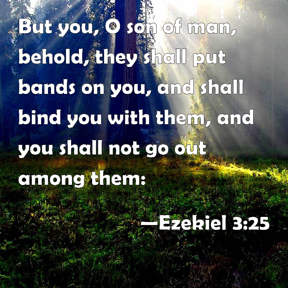 Choose a Background Ezekiel 3:25 But you, O son of man, behold, they shall put bands on you, and shall bind you with them, and you shall not go out among them: KJV: But thou, O son of man, behold, they shall put bands upon thee, and shall bind thee with them, and thou shalt not go out among them: DRB: And thou, O son of man, behold they shall put bands upon thee, and they shall bind thee with them: and thou shalt not go forth from the midst of them. DBT: And thou, son of man, behold, they shall put bands upon thee, and shall bind thee therewith, and thou shalt not go out among them. ERV: But thou, son of man, behold, they shall lay bands upon thee, and shall bind thee with them, and thou shalt not go out among them: WBT: But thou, O son of man, behold, they shall put bands upon thee, and shall bind thee with them, and thou shalt not go out among them: WEB: But you, son of man, behold, they shall lay bands on you, and shall bind you with them, and you shall not go out among them: YLT: 'And thou, son of man, lo, they have put on thee thick bands, and have bound thee with them, and thou goest not forth in their midst;Links Ezekiel 3:25 NIV • Ezekiel 3:25 NLT • Ezekiel 3:25 ESV • Ezekiel 3:25 NASB • Ezekiel 3:25 KJV • Ezekiel 3:25 Interlinear • Ezekiel 3:25 Commentaries • Ezekiel 3:25 Parallel Texts • Ezekiel 3:25 Bible Apps • Ezekiel 3:25 Parallel • Bible Hub |