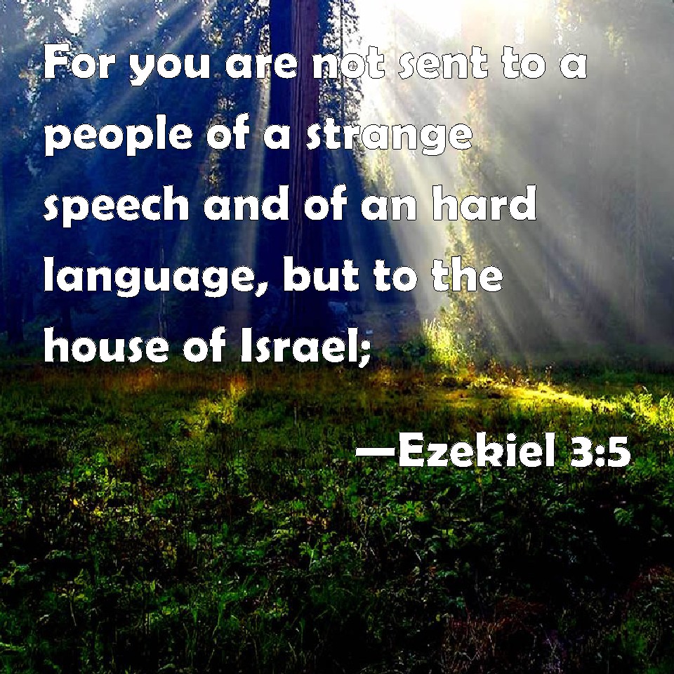 Choose a Background Ezekiel 3:5 For you are not sent to a people of a strange speech and of an hard language, but to the house of Israel; KJV: For thou art not sent to a people of a strange speech and of an hard language, but to the house of Israel; DRB: For thou art not sent to a people of a profound speech, and of an unknown tongue, but to the house of Israel: DBT: For thou art not sent to a people of strange language, and of difficult speech, but to the house of Israel; ERV: For thou art not sent to a people of a strange speech and of an hard language, but to the house of Israel; WBT: For thou art not sent to a people of a strange speech and of a hard language, but to the house of Israel; WEB: For you are not sent to a people of a strange speech and of a hard language, but to the house of Israel; YLT: For, not unto a people deep of lip and heavy of tongue art thou sent — unto the house of Israel;Links Ezekiel 3:5 NIV • Ezekiel 3:5 NLT • Ezekiel 3:5 ESV • Ezekiel 3:5 NASB • Ezekiel 3:5 KJV • Ezekiel 3:5 Interlinear • Ezekiel 3:5 Commentaries • Ezekiel 3:5 Parallel Texts • Ezekiel 3:5 Bible Apps • Ezekiel 3:5 Parallel • Bible Hub |
