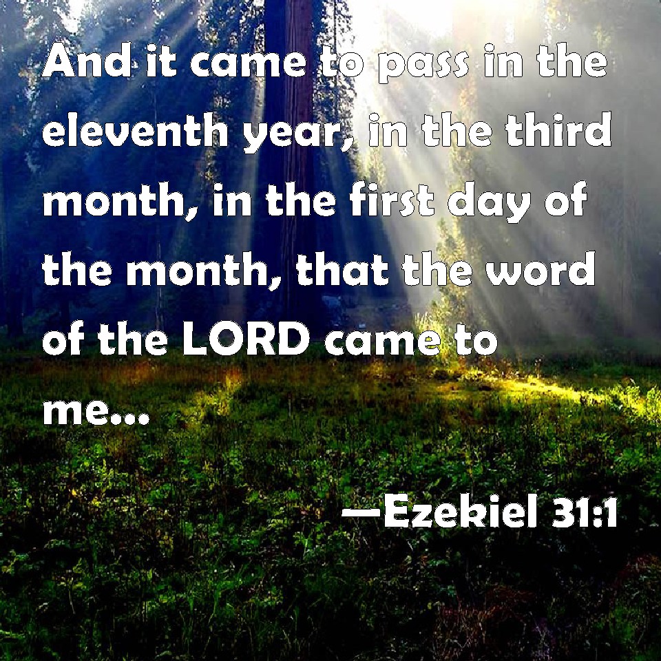 Choose a Background Ezekiel 31:1 And it came to pass in the eleventh year, in the third month, in the first day of the month, that the word of the LORD came to me, saying, KJV: And it came to pass in the eleventh year, in the third month, in the first day of the month, that the word of the LORD came unto me, saying, DRB: And it came to pass in the eleventh year, the third month, the first day of the month, that the word of the Lord came to me, saying: DBT: And it came to pass in the eleventh year, in the third month, on the first of the month, that the word of Jehovah came unto me, saying, ERV: And it came to pass in the eleventh year, in the third month, in the first day of the month, that the word of the LORD came unto me, saying, WBT: And it came to pass in the eleventh year, in the third month, in the first day of the month, that the word of the LORD came to me, saying, WEB: It happened in the eleventh year, in the third [month], in the first [day] of the month, that the word of Yahweh came to me, saying, YLT: And it cometh to pass, in the eleventh year, in the third month, in the first of the month, hath a word of Jehovah been unto me, saying:Links Ezekiel 31:1 NIV • Ezekiel 31:1 NLT • Ezekiel 31:1 ESV • Ezekiel 31:1 NASB • Ezekiel 31:1 KJV • Ezekiel 31:1 Interlinear • Ezekiel 31:1 Commentaries • Ezekiel 31:1 Parallel Texts • Ezekiel 31:1 Bible Apps • Ezekiel 31:1 Parallel • Bible Hub |