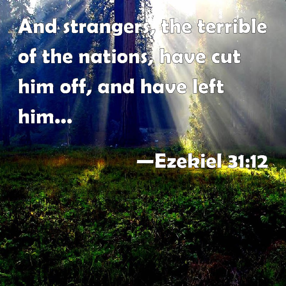 Choose a Background Ezekiel 31:12 And strangers, the terrible of the nations, have cut him off, and have left him: on the mountains and in all the valleys his branches are fallen, and his boughs are broken by all the rivers of the land; and all the people of the earth are gone down from his shadow, and have left him. KJV: And strangers, the terrible of the nations, have cut him off, and have left him: upon the mountains and in all the valleys his branches are fallen, and his boughs are broken by all the rivers of the land; and all the people of the earth are gone down from his shadow, and have left him. DRB: And strangers, and the most cruel of the nations shall cut him down, and cast him away upon the mountains, and his boughs shall fall in every valley, and his branches shall be broken on every rock of the country: and all the people of the earth shall depart from his shadow, and leave him. DBT: And strangers, the terrible of the nations, have cut him off and have left him; upon the mountains and in all the valleys his branches are fallen, and his boughs are broken in all the watercourses of the land; and all the peoples of the earth are gone down from his shadow, and have left him. ERV: And strangers, the terrible of the nations, have cut him off, and have left him: upon the mountains and in all the valleys his branches are fallen, and his boughs are broken by all the watercourses of the land; and all the peoples of the earth are gone down from his shadow, and have left him. WBT: And strangers, the terrible of the nations, have cut him off, and have left him: upon the mountains and in all the valleys his branches are fallen, and his boughs are broken by all the rivers of the land; and all the people of the earth have gone down from his shade, and have left him. WEB: Strangers, the terrible of the nations, have cut him off, and have left him: on the mountains and in all the valleys his branches are fallen, and his boughs are broken by all the watercourses of the land; and all the peoples of the earth are gone down from his shadow, and have left him. YLT: And cut him off do strangers, The terrible of nations, and they leave him, On the mountains and in all valleys have his thin shoots fallen, And broken are his boughs at all streams of the land, And go down from his shade do all peoples of the land, and they leave him.Links Ezekiel 31:12 NIV • Ezekiel 31:12 NLT • Ezekiel 31:12 ESV • Ezekiel 31:12 NASB • Ezekiel 31:12 KJV • Ezekiel 31:12 Interlinear • Ezekiel 31:12 Commentaries • Ezekiel 31:12 Parallel Texts • Ezekiel 31:12 Bible Apps • Ezekiel 31:12 Parallel • Bible Hub |