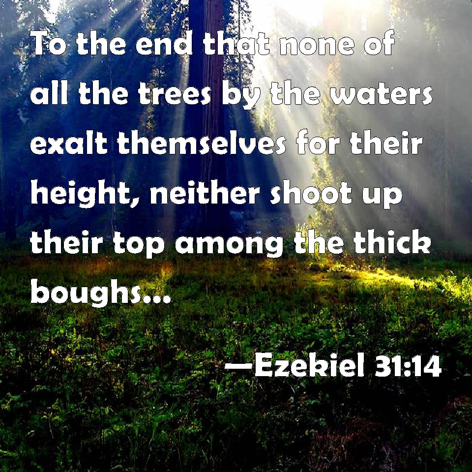 Choose a Background Ezekiel 31:14 To the end that none of all the trees by the waters exalt themselves for their height, neither shoot up their top among the thick boughs, neither their trees stand up in their height, all that drink water: for they are all delivered to death, to the nether parts of the earth, in the middle of the children of men, with them that go down to the pit. KJV: To the end that none of all the trees by the waters exalt themselves for their height, neither shoot up their top among the thick boughs, neither their trees stand up in their height, all that drink water: for they are all delivered unto death, to the nether parts of the earth, in the midst of the children of men, with them that go down to the pit. DRB: For which cause none of the trees by the waters shall exalt themselves for their height: nor shoot up their tops among the thick branches and leaves, neither shall any of them that are watered stand up in their height: for they are all delivered unto death to the lowest parts of the earth, in the midst of the children of men, with them that go down into the pit. DBT: to the end that none of all the trees by the waters exalt themselves in their stature, nor set their top amidst the thick boughs, and that none of them that drink water stand up in his height by himself; for they are all given over unto death in the lower parts of the earth, in the midst of the children of men, with them that go down to the pit. ERV: to the end that none of all the trees by the waters exalt themselves in their stature, neither set their top among the thick boughs, nor that their mighty ones stand up in their height, even all that drink water: for they are all delivered unto death, to the nether parts of the earth, in the midst of the children of men, with them that go down to the pit. WBT: To the end that none of all the trees by the waters exalt themselves for their hight, neither shoot up their top among the thick boughs, neither their trees stand up in their hight, all that drink water: for they are all delivered to death, to the nether parts of the earth, in the midst of the children of men, with them that go down to the pit. WEB: to the end that none of all the trees by the waters exalt themselves in their stature, neither set their top among the thick boughs, nor that their mighty ones stand up on their height, [even] all who drink water: for they are all delivered to death, to the lower parts of the earth, in the midst of the children of men, with those who go down to the pit. YLT: In order that none of the trees of the waters May become haughty because of their stature, Nor give their foliage between thickets, Nor any drinking waters stand up unto them in their haughtiness, For all of them are given up to death, Unto the earth — the lower part, In the midst of the sons of men, Unto those going down to the pit.Links Ezekiel 31:14 NIV • Ezekiel 31:14 NLT • Ezekiel 31:14 ESV • Ezekiel 31:14 NASB • Ezekiel 31:14 KJV • Ezekiel 31:14 Interlinear • Ezekiel 31:14 Commentaries • Ezekiel 31:14 Parallel Texts • Ezekiel 31:14 Bible Apps • Ezekiel 31:14 Parallel • Bible Hub |