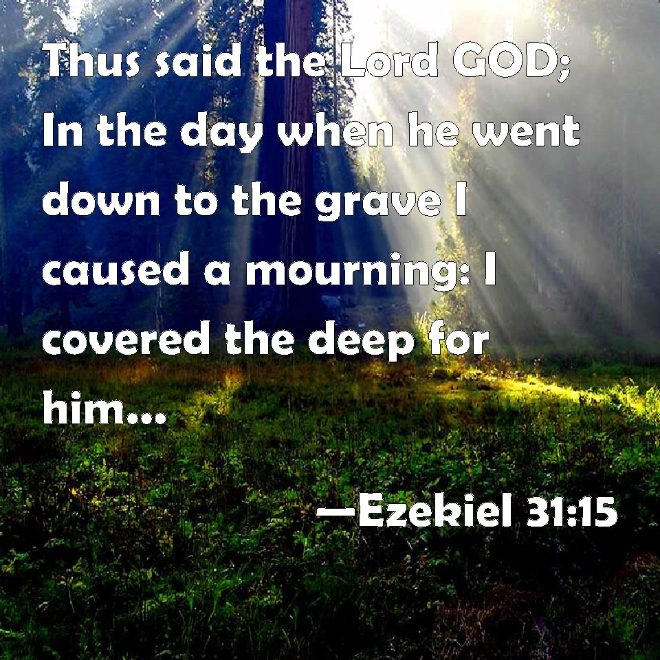 Choose a Background Ezekiel 31:15 Thus said the Lord GOD; In the day when he went down to the grave I caused a mourning: I covered the deep for him, and I restrained the floods thereof, and the great waters were stayed: and I caused Lebanon to mourn for him, and all the trees of the field fainted for him. KJV: Thus saith the Lord GOD; In the day when he went down to the grave I caused a mourning: I covered the deep for him, and I restrained the floods thereof, and the great waters were stayed: and I caused Lebanon to mourn for him, and all the trees of the field fainted for him. DRB: Thus saith the Lord God: In the day when he went down to hell, I brought in mourning, I covered him with the deep: and I withheld its rivers, and restrained the many waters: Libanus grieved for him, and all the trees of the field trembled. DBT: Thus saith the Lord Jehovah: In the day when he went down to Sheol, I caused a mourning: I covered the deep for him, and I restrained the floods thereof, and the great waters were stayed; and I made Lebanon black for him, and all the trees of the field fainted for him. ERV: Thus saith the Lord GOD: In the day when he went down to hell I caused a mourning: I covered the deep for him, and I restrained the rivers thereof, and the great waters were stayed: and I caused Lebanon to mourn for him, and all the trees of the field fainted for him. WBT: Thus saith the Lord GOD; In the day when he went down to the grave I caused a mourning: I covered the deep for him, and I restrained its floods, and the great waters were stayed: and I caused Lebanon to mourn for him, and all the trees of the field fainted for him. WEB: Thus says the Lord Yahweh: In the day when he went down to Sheol I caused a mourning: I covered the deep for him, and I restrained its rivers; and the great waters were stayed; and I caused Lebanon to mourn for him, and all the trees of the field fainted for him. YLT: Thus said the Lord Jehovah: In the day of his going down to sheol I have caused mourning, I have covered for him the deep, and diminish its flowings, And restrained are many waters, And I make Lebanon black for him, And all trees of the field have been covered for him.Links Ezekiel 31:15 NIV • Ezekiel 31:15 NLT • Ezekiel 31:15 ESV • Ezekiel 31:15 NASB • Ezekiel 31:15 KJV • Ezekiel 31:15 Interlinear • Ezekiel 31:15 Commentaries • Ezekiel 31:15 Parallel Texts • Ezekiel 31:15 Bible Apps • Ezekiel 31:15 Parallel • Bible Hub |