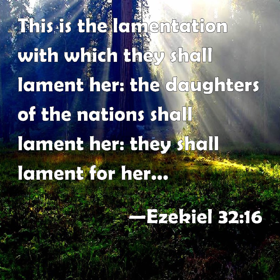 Choose a Background Ezekiel 32:16 This is the lamentation with which they shall lament her: the daughters of the nations shall lament her: they shall lament for her, even for Egypt, and for all her multitude, said the Lord GOD. KJV: This is the lamentation wherewith they shall lament her: the daughters of the nations shall lament her: they shall lament for her, even for Egypt, and for all her multitude, saith the Lord GOD. DRB: This is the lamentation, and they shall lament therewith: the daughters of the nations shall lament therewith: for Egypt, and for the multitude thereof they shall lament therewith, saith the Lord God. DBT: It is a lamentation, and thus they shall lament her: the daughters of the nations shall say it in lamenting; they shall say it in lamenting over Egypt and over all her multitude, saith the Lord Jehovah. ERV: This is the lamentation wherewith they shall lament; the daughters of the nations shall lament therewith: for Egypt, and for all her multitude, shall they lament therewith, saith the Lord GOD. WBT: This is the lamentation with which they shall lament her: the daughters of the nations shall lament her: they shall lament for her, even for Egypt, and for all her multitude, saith the Lord GOD. WEB: This is the lamentation with which they shall lament; the daughters of the nations shall lament therewith; over Egypt, and over all her multitude, shall they lament therewith, says the Lord Yahweh. YLT: A lamentation it is, and they have lamented her, Daughters of the nations do lament her, For Egypt, and for all her multitude, they lament her, An affirmation of the Lord Jehovah.'Links Ezekiel 32:16 NIV • Ezekiel 32:16 NLT • Ezekiel 32:16 ESV • Ezekiel 32:16 NASB • Ezekiel 32:16 KJV • Ezekiel 32:16 Interlinear • Ezekiel 32:16 Commentaries • Ezekiel 32:16 Parallel Texts • Ezekiel 32:16 Bible Apps • Ezekiel 32:16 Parallel • Bible Hub |