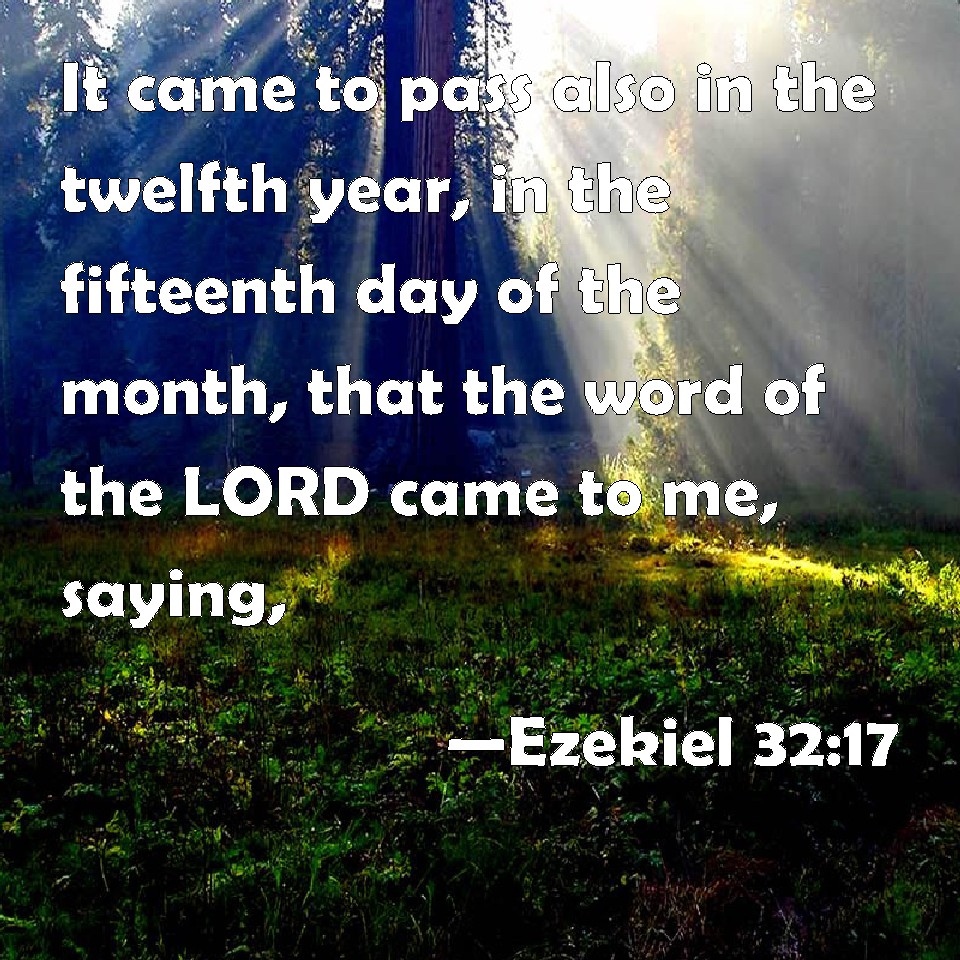 Choose a Background Ezekiel 32:17 It came to pass also in the twelfth year, in the fifteenth day of the month, that the word of the LORD came to me, saying, KJV: It came to pass also in the twelfth year, in the fifteenth day of the month, that the word of the LORD came unto me, saying, DRB: And it came to pass in the twelfth year, in the fifteenth day of the month that the word of the Lord came to me, saying: DBT: And it came to pass in the twelfth year, on the fifteenth of the month, the word of Jehovah came unto me, saying, ERV: It came to pass also in the twelfth year, in the fifteenth day of the month, that the word of the LORD came unto me, saying, WBT: It came to pass also in the twelfth year, in the fifteenth day of the month, that the word of the LORD came to me, saying, WEB: It happened also in the twelfth year, in the fifteenth [day] of the month, that the word of Yahweh came to me, saying, YLT: And it cometh to pass, in the twelfth year, in the fifteenth of the month, hath a word of Jehovah been unto me, saying,Links Ezekiel 32:17 NIV • Ezekiel 32:17 NLT • Ezekiel 32:17 ESV • Ezekiel 32:17 NASB • Ezekiel 32:17 KJV • Ezekiel 32:17 Interlinear • Ezekiel 32:17 Commentaries • Ezekiel 32:17 Parallel Texts • Ezekiel 32:17 Bible Apps • Ezekiel 32:17 Parallel • Bible Hub |