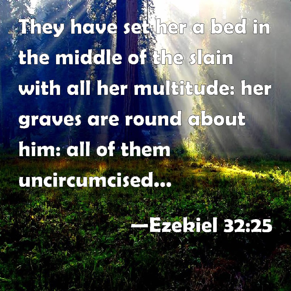 Ezekiel 32:25 They have set her a bed in the middle of the slain with all her multitude: her graves are round about him: all of them uncircumcised, slain by the sword: though their terror was caused in the land of the living, yet have they borne their shame with them that go down to the pit: he is put in the middle of them that be slain.