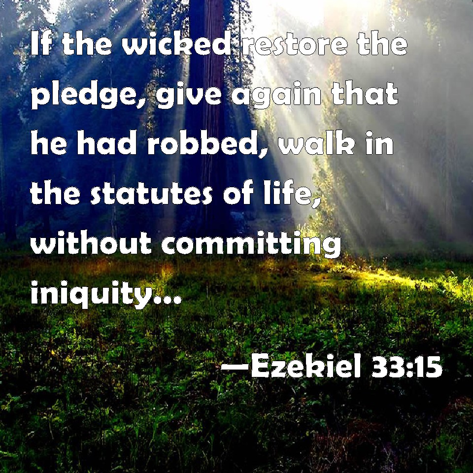 Choose a Background Ezekiel 33:15 If the wicked restore the pledge, give again that he had robbed, walk in the statutes of life, without committing iniquity; he shall surely live, he shall not die. KJV: If the wicked restore the pledge, give again that he had robbed, walk in the statutes of life, without committing iniquity; he shall surely live, he shall not die. DRB: And if that wicked man restore the pledge, and render what he had robbed, and walk in the commandments of life, and do no unjust thing: he shall surely live, and shall not die. DBT: if the wicked restore the pledge, give again that he had taken by robbery, walk in the statutes of life, doing nothing that is wrong; he shall certainly live, he shall not die. ERV: if the wicked restore the pledge, give again that he had taken by robbery, walk in the statutes of life, committing no iniquity; he shall surely live, he shall not die. WBT: If the wicked shall restore the pledge, give again that which he had robbed, walk in the statutes of life, without committing iniquity; he shall surely live, he shall not die. WEB: if the wicked restore the pledge, give again that which he had taken by robbery, walk in the statutes of life, committing no iniquity; he shall surely live, he shall not die. YLT: (The pledge the wicked restoreth, plunder he repayeth,) In the statutes of life he hath walked, So as not to do perversity, He surely liveth — he doth not die.Links Ezekiel 33:15 NIV • Ezekiel 33:15 NLT • Ezekiel 33:15 ESV • Ezekiel 33:15 NASB • Ezekiel 33:15 KJV • Ezekiel 33:15 Interlinear • Ezekiel 33:15 Commentaries • Ezekiel 33:15 Parallel Texts • Ezekiel 33:15 Bible Apps • Ezekiel 33:15 Parallel • Bible Hub |