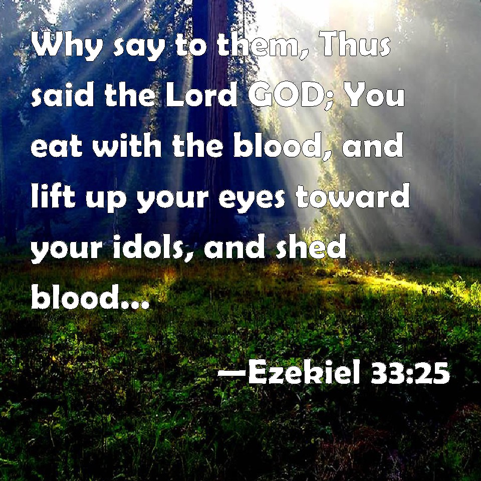 Choose a Background Ezekiel 33:25 Why say to them, Thus said the Lord GOD; You eat with the blood, and lift up your eyes toward your idols, and shed blood: and shall you possess the land? KJV: Wherefore say unto them, Thus saith the Lord GOD; Ye eat with the blood, and lift up your eyes toward your idols, and shed blood: and shall ye possess the land? DRB: Therefore say to them: Thus saith the Lord God, You that eat with the blood and lift up your eyes to your uncleannesses, and that shed blood: shall you possess the land by inheritance? DBT: Therefore say unto them, Thus saith the Lord Jehovah: Ye eat with the blood, and lift up your eyes toward your idols, and shed blood; and shall ye possess the land? ERV: Wherefore say unto them, Thus saith the Lord GOD: Ye eat with the blood, and lift up your eyes unto your idols, and shed blood: and shall ye possess the land? WBT: Wherefore say to them, Thus saith the Lord GOD; Ye eat with the blood, and lift up your eyes towards your idols, and shed blood: and shall ye possess the land? WEB: Therefore tell them, Thus says the Lord Yahweh: You eat with the blood, and lift up your eyes to your idols, and shed blood: and shall you possess the land? YLT: Therefore say unto them: Thus said the Lord Jehovah: With the blood ye do eat, And your eyes ye lift up unto your idols, And blood ye shed, and the land ye inherit!Links Ezekiel 33:25 NIV • Ezekiel 33:25 NLT • Ezekiel 33:25 ESV • Ezekiel 33:25 NASB • Ezekiel 33:25 KJV • Ezekiel 33:25 Interlinear • Ezekiel 33:25 Commentaries • Ezekiel 33:25 Parallel Texts • Ezekiel 33:25 Bible Apps • Ezekiel 33:25 Parallel • Bible Hub |