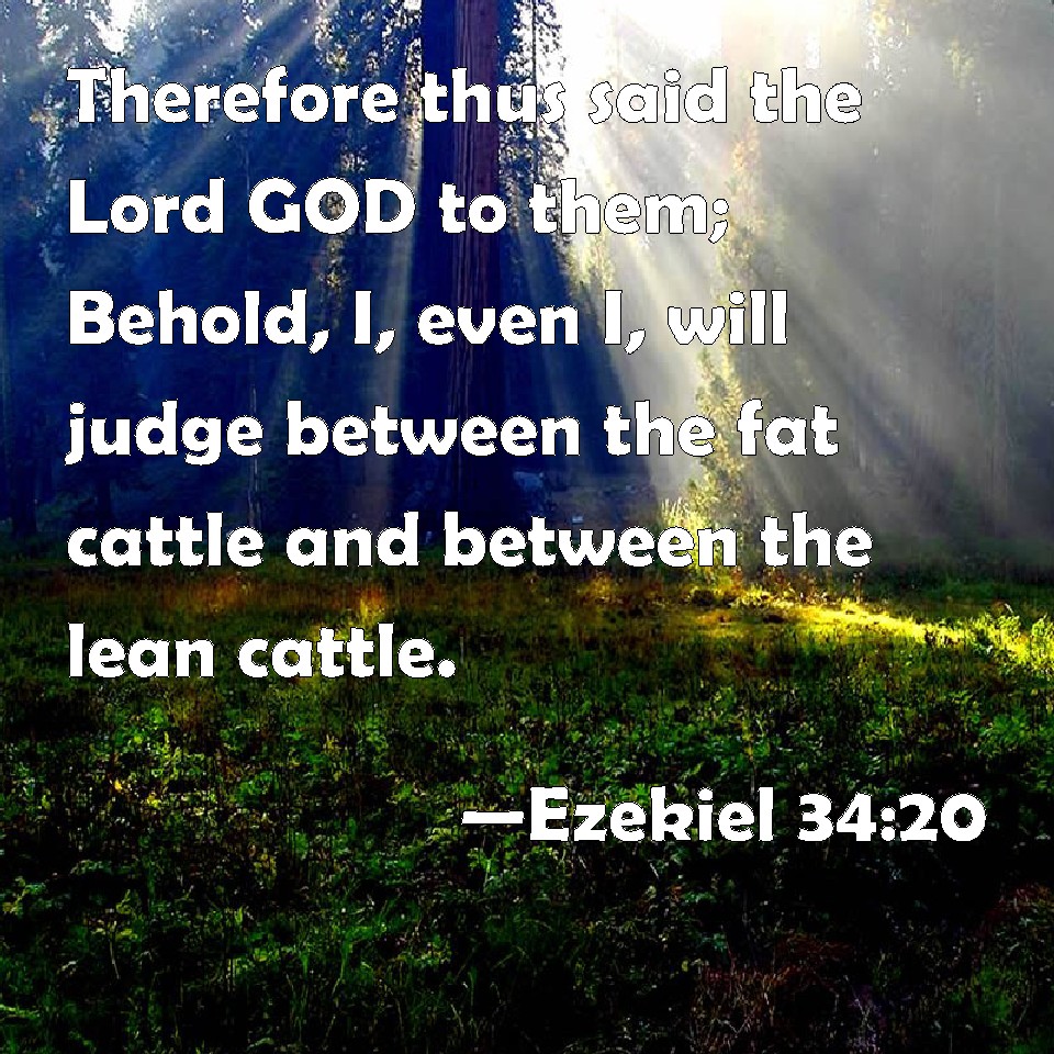 Choose a Background Ezekiel 34:20 Therefore thus said the Lord GOD to them; Behold, I, even I, will judge between the fat cattle and between the lean cattle. KJV: Therefore thus saith the Lord GOD unto them; Behold, I, even I, will judge between the fat cattle and between the lean cattle. DRB: Therefore thus saith the Lord God to you: Behold, I myself will judge between the fat cattle and the lean. DBT: Therefore thus saith the Lord Jehovah unto them: Behold, it is I, and I will judge between the fat sheep and the lean sheep. ERV: Therefore thus saith the Lord GOD unto them: Behold, I, even I, judge between the fat cattle and the lean cattle. WBT: Therefore thus saith the Lord GOD to them; Behold, I, even I, will judge between the fat cattle and between the lean cattle. WEB: Therefore thus says the Lord Yahweh to them: Behold, I, even I, will judge between the fat sheep and the lean sheep. YLT: Therefore, thus said the Lord Jehovah to them: Lo, I — even I, have judged between fat sheep and lean sheep.Links Ezekiel 34:20 NIV • Ezekiel 34:20 NLT • Ezekiel 34:20 ESV • Ezekiel 34:20 NASB • Ezekiel 34:20 KJV • Ezekiel 34:20 Interlinear • Ezekiel 34:20 Commentaries • Ezekiel 34:20 Parallel Texts • Ezekiel 34:20 Bible Apps • Ezekiel 34:20 Parallel • Bible Hub |