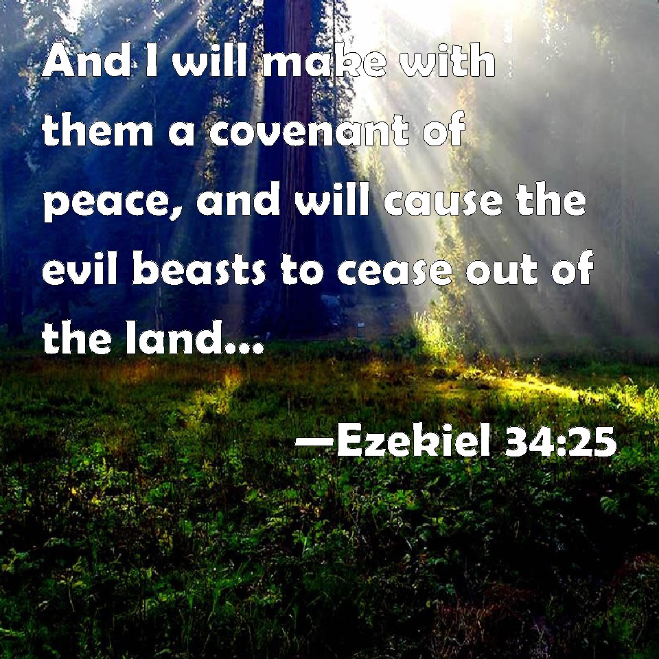 Choose a Background Ezekiel 34:25 And I will make with them a covenant of peace, and will cause the evil beasts to cease out of the land: and they shall dwell safely in the wilderness, and sleep in the woods. KJV: And I will make with them a covenant of peace, and will cause the evil beasts to cease out of the land: and they shall dwell safely in the wilderness, and sleep in the woods. DRB: And I will make a covenant of peace with them, and will cause the evil beasts to cease out of the land: and they that dwell in the wilderness shall sleep secure in the forests. DBT: And I will make with them a covenant of peace, and will cause evil beasts to cease out of the land; and they shall dwell in safety in the wilderness, and sleep in the woods. ERV: And I will make with them a covenant of peace, and will cause evil beasts to cease out of the land: and they shall dwell securely in the wilderness, and sleep in the woods. WBT: And I will make with them a covenant of peace, and will cause the evil beasts to cease out of the land: and they shall dwell safely in the wilderness, and sleep in the woods. WEB: I will make with them a covenant of peace, and will cause evil animals to cease out of the land; and they shall dwell securely in the wilderness, and sleep in the woods. YLT: And I have made for them a covenant of peace, And caused evil beasts to cease out of the land, And they have dwelt in a wilderness confidently, And they have slept in forests.Links Ezekiel 34:25 NIV • Ezekiel 34:25 NLT • Ezekiel 34:25 ESV • Ezekiel 34:25 NASB • Ezekiel 34:25 KJV • Ezekiel 34:25 Interlinear • Ezekiel 34:25 Commentaries • Ezekiel 34:25 Parallel Texts • Ezekiel 34:25 Bible Apps • Ezekiel 34:25 Parallel • Bible Hub |