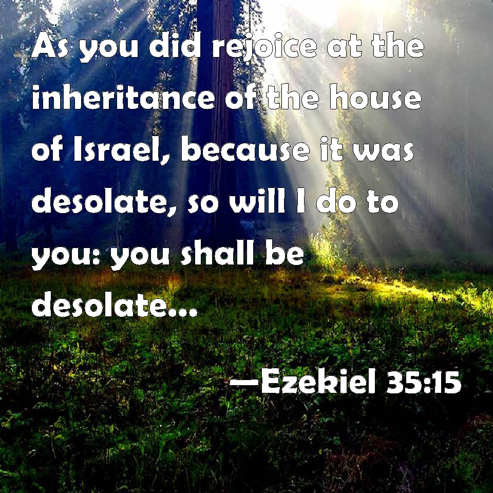 Choose a Background Ezekiel 35:15 As you did rejoice at the inheritance of the house of Israel, because it was desolate, so will I do to you: you shall be desolate, O mount Seir, and all Idumea, even all of it: and they shall know that I am the LORD. KJV: As thou didst rejoice at the inheritance of the house of Israel, because it was desolate, so will I do unto thee: thou shalt be desolate, O mount Seir, and all Idumea, even all of it: and they shall know that I am the LORD. DRB: As thou best rejoiced over the inheritance of the house of Israel, because it was laid waste, so will I do to thee: thou shalt be laid waste, O mount Seir, and all Idumea: and they shall know that I am the Lord. DBT: As thou didst rejoice at the inheritance of the house of Israel, because it was desolated, so will I do unto thee: thou shalt be a desolation, O mount Seir, and all Edom, the whole of it: and they shall know that I am Jehovah. ERV: As thou didst rejoice over the inheritance of the house of Israel, because it was desolate, so will I do unto thee: thou shalt be desolate, O mount Seir, and all Edom, even all of it: and they shall know that I am the LORD. WBT: As thou didst rejoice at the inheritance of the house of Israel, because it was desolate, so will I do to thee: thou shalt be desolate, O mount Seir, and all Edom, even all of it: and they shall know that I am the LORD. WEB: As you rejoiced over the inheritance of the house of Israel, because it was desolate, so will I do to you: you shall be desolate, Mount Seir, and all Edom, even all of it; and they shall know that I am Yahweh. YLT: According to thy joy at the inheritance of the house of Israel because of desolation, So I do to thee — a desolation thou art, O mount Seir, and all Edom — all of it, And they have known that I am Jehovah!Links Ezekiel 35:15 NIV • Ezekiel 35:15 NLT • Ezekiel 35:15 ESV • Ezekiel 35:15 NASB • Ezekiel 35:15 KJV • Ezekiel 35:15 Interlinear • Ezekiel 35:15 Commentaries • Ezekiel 35:15 Parallel Texts • Ezekiel 35:15 Bible Apps • Ezekiel 35:15 Parallel • Bible Hub |
