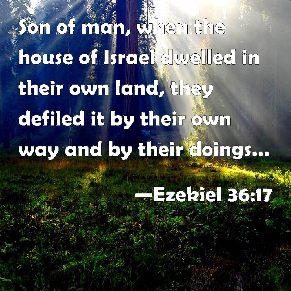 Choose a Background Ezekiel 36:17 Son of man, when the house of Israel dwelled in their own land, they defiled it by their own way and by their doings: their way was before me as the uncleanness of a removed woman. KJV: Son of man, when the house of Israel dwelt in their own land, they defiled it by their own way and by their doings: their way was before me as the uncleanness of a removed woman. DRB: Son of man, when the house of Israel dwelt in their own land, they defiled it with their ways, and with their doings: their way was before me like the uncleanness of a menstruous woman. DBT: Son of man, when the house of Israel dwelt in their own land, they defiled it by their way and by their doings: their way was before me as the uncleanness of a woman in her separation. ERV: Son of man, when the house of Israel dwelt in their own land, they defiled it by their way and by their doings: their way before me was as the uncleanness of a woman in her separation. WBT: Son of man, when the house of Israel dwelt in their own land, they defiled it by their own way and by their doings: their way was before me as the uncleanness of a removed woman. WEB: Son of man, when the house of Israel lived in their own land, they defiled it by their way and by their doings: their way before me was as the uncleanness of a woman in her impurity. YLT: 'Son of man, The house of Israel are dwelling on their land, And they defile it by their way and by their doings, As the uncleanness of a separated one hath their way been before Me.Links Ezekiel 36:17 NIV • Ezekiel 36:17 NLT • Ezekiel 36:17 ESV • Ezekiel 36:17 NASB • Ezekiel 36:17 KJV • Ezekiel 36:17 Interlinear • Ezekiel 36:17 Commentaries • Ezekiel 36:17 Parallel Texts • Ezekiel 36:17 Bible Apps • Ezekiel 36:17 Parallel • Bible Hub |