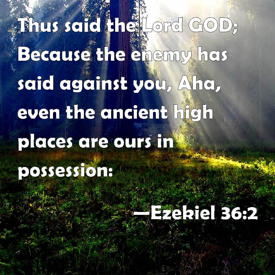 Choose a Background Ezekiel 36:2 Thus said the Lord GOD; Because the enemy has said against you, Aha, even the ancient high places are ours in possession: KJV: Thus saith the Lord GOD; Because the enemy hath said against you, Aha, even the ancient high places are ours in possession: DRB: Thus saith the Lord God: Because the enemy hath said of you: Aha, the everlasting heights are given to us for an inheritance. DBT: Thus saith the Lord Jehovah: Because the enemy hath said against you, Aha! and, The ancient high places are become ours in possession; ERV: Thus saith the Lord GOD: Because the enemy hath said against you, Aha! and, The ancient high places are ours in possession: WBT: Thus saith the Lord GOD; Because the enemy had said against you, Aha, even the ancient high places are ours in possession: WEB: Thus says the Lord Yahweh: Because the enemy has said against you, Aha! and, The ancient high places are ours in possession; YLT: Thus said the Lord Jehovah: Because the enemy said against you, Aha, and the high places of old for a possession have been to us,Links Ezekiel 36:2 NIV • Ezekiel 36:2 NLT • Ezekiel 36:2 ESV • Ezekiel 36:2 NASB • Ezekiel 36:2 KJV • Ezekiel 36:2 Interlinear • Ezekiel 36:2 Commentaries • Ezekiel 36:2 Parallel Texts • Ezekiel 36:2 Bible Apps • Ezekiel 36:2 Parallel • Bible Hub |