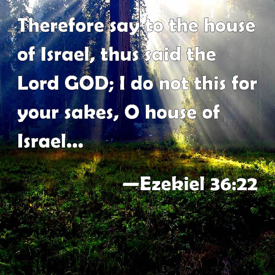 Choose a Background Ezekiel 36:22 Therefore say to the house of Israel, thus said the Lord GOD; I do not this for your sakes, O house of Israel, but for my holy name's sake, which you have profaned among the heathen, where you went. KJV: Therefore say unto the house of Israel, Thus saith the Lord GOD; I do not this for your sakes, O house of Israel, but for mine holy name's sake, which ye have profaned among the heathen, whither ye went. DRB: Therefore thou shalt say to the house of Israel: Thus saith the Lord God: It is not for your sake that I will do this, O house of Israel, but for my holy name's sake, which you have profaned among the nations whither you went. DBT: Therefore say unto the house of Israel, Thus saith the Lord Jehovah: I do not this for your sakes, O house of Israel, but for my holy name, which ye have profaned among the nations whither ye went. ERV: Therefore say unto the house of Israel, Thus saith the Lord GOD: I do not this for your sake, O house of Israel, but for mine holy name, which ye have profaned among the nations, whither ye went. WBT: Therefore say to the house of Israel, Thus saith the Lord GOD; I do not this for your sakes, O house of Israel, but for my holy name's sake, which ye have profaned among the heathen, whither ye went. WEB: Therefore tell the house of Israel, Thus says the Lord Yahweh: I don't do [this] for your sake, house of Israel, but for my holy name, which you have profaned among the nations, where you went. YLT: Therefore, say to the house of Israel, Thus said the Lord Jehovah: Not for your sake am I working, O house of Israel, But — for My holy name, That ye have polluted among nations whither ye have gone in.Links Ezekiel 36:22 NIV • Ezekiel 36:22 NLT • Ezekiel 36:22 ESV • Ezekiel 36:22 NASB • Ezekiel 36:22 KJV • Ezekiel 36:22 Interlinear • Ezekiel 36:22 Commentaries • Ezekiel 36:22 Parallel Texts • Ezekiel 36:22 Bible Apps • Ezekiel 36:22 Parallel • Bible Hub |