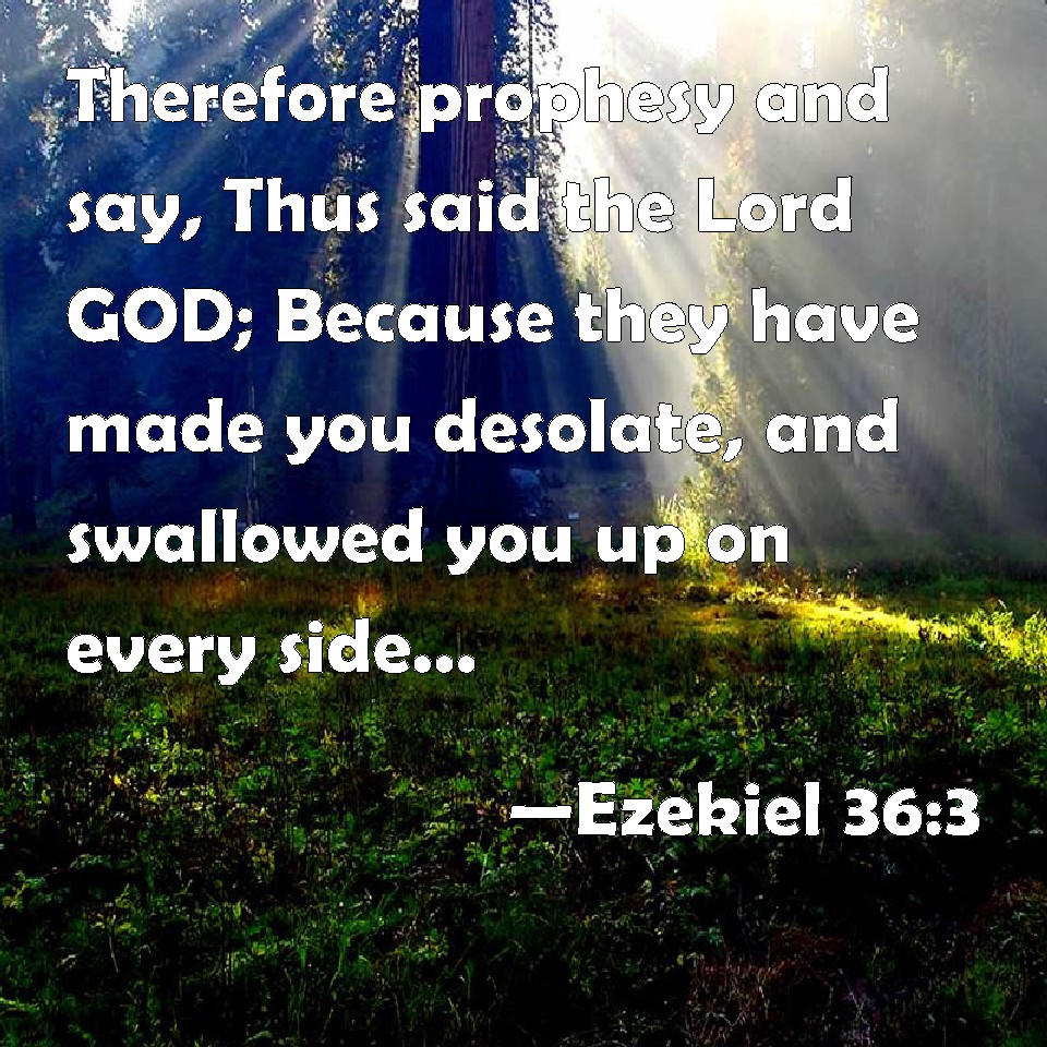 Choose a Background Ezekiel 36:3 Therefore prophesy and say, Thus said the Lord GOD; Because they have made you desolate, and swallowed you up on every side, that you might be a possession to the residue of the heathen, and you are taken up in the lips of talkers, and are an infamy of the people: KJV: Therefore prophesy and say, Thus saith the Lord GOD; Because they have made you desolate, and swallowed you up on every side, that ye might be a possession unto the residue of the heathen, and ye are taken up in the lips of talkers, and are an infamy of the people: DRB: Therefore prophesy, and say: Thus saith the Lord God: Because you have been desolate, and trodden under foot on every side, and made an inheritance to the rest of the nations, and are become the subject of the talk, and the reproach of the people: DBT: therefore prophesy and say, Thus saith the Lord Jehovah: Because, yea, because they have made you desolate, and have swallowed you up on every side, that ye might be a possession unto the remnant of the nations, and ye are taken up in the lips of talkers, and in the defaming of the people: ERV: therefore prophesy, and say, Thus saith the Lord GOD: Because, even because they have made you desolate, and swallowed you up on every side, that ye might be a possession unto the residue of the nations, and ye are taken up in the lips of talkers, and the evil report of the people: WBT: Therefore prophesy and say, Thus saith the Lord GOD; Because they have made you desolate, and swallowed you up on every side, that ye might be a possession to the residue of the heathen, and ye are taken up in the lips of talkers, and are an infamy of the people: WEB: therefore prophesy, and say, Thus says the Lord Yahweh: Because, even because they have made you desolate, and swallowed you up on every side, that you might be a possession to the residue of the nations, and you are taken up in the lips of talkers, and the evil report of the people; YLT: therefore, prophesy, and thou hast said: Thus said the Lord Jehovah: Because, even because, of desolating, And of swallowing you up from round about, For your being a possession to the remnant of the nations, And ye are taken up on the tip of the tongue, And are an evil report of the people.Links Ezekiel 36:3 NIV • Ezekiel 36:3 NLT • Ezekiel 36:3 ESV • Ezekiel 36:3 NASB • Ezekiel 36:3 KJV • Ezekiel 36:3 Interlinear • Ezekiel 36:3 Commentaries • Ezekiel 36:3 Parallel Texts • Ezekiel 36:3 Bible Apps • Ezekiel 36:3 Parallel • Bible Hub |