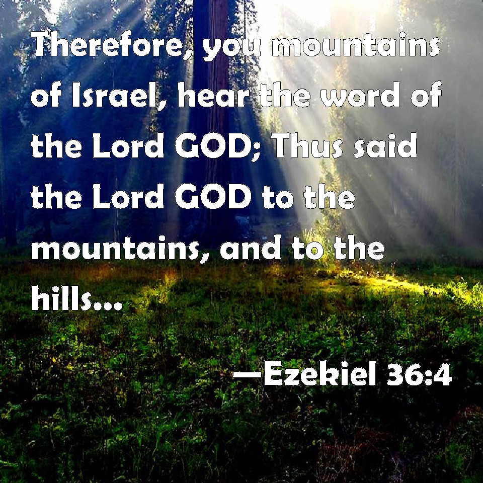 Choose a Background Ezekiel 36:4 Therefore, you mountains of Israel, hear the word of the Lord GOD; Thus said the Lord GOD to the mountains, and to the hills, to the rivers, and to the valleys, to the desolate wastes, and to the cities that are forsaken, which became a prey and derision to the residue of the heathen that are round about; KJV: Therefore, ye mountains of Israel, hear the word of the Lord GOD; Thus saith the Lord GOD to the mountains, and to the hills, to the rivers, and to the valleys, to the desolate wastes, and to the cities that are forsaken, which became a prey and derision to the residue of the heathen that are round about; DRB: Therefore, ye mountains of Israel, hear the word of the Lord God: Thus saith the Lord God to the mountains, and to the hills, to the brooks, and to the valleys, and to desolate places, and ruinous walls, and to the cities that are forsaken, that are spoiled, and derided by the rest of the nations round about. DBT: therefore, ye mountains of Israel, hear the word of the Lord Jehovah. Thus saith the Lord Jehovah to the mountains and to the hills, to the water-courses and to the valleys, to the desolate wastes and to the cities that are forsaken, which are become a prey and a derision to the remnant of the nations that are round about, ERV: therefore, ye mountains of Israel, hear the word of the Lord GOD; Thus saith the Lord GOD to the mountains and to the hills, to the watercourses and to the valleys, to the desolate wastes and to the cities that are forsaken, which are become a prey and derision to the residue of the nations that are round about: WBT: Therefore, ye mountains of Israel, hear the word of the Lord GOD; Thus saith the Lord GOD to the mountains, and to the hills, to the rivers, and to the valleys, to the desolate wastes, and to the cities that are forsaken, which became a prey and derision to the residue of the heathen that are around; WEB: therefore, you mountains of Israel, hear the word of the Lord Yahweh: Thus says the Lord Yahweh to the mountains and to the hills, to the watercourses and to the valleys, to the desolate wastes and to the cities that are forsaken, which are become a prey and derision to the residue of the nations that are all around; YLT: Therefore, O mountains of Israel, Hear a word of the Lord Jehovah: Thus said the Lord Jehovah, to mountains, and to hills, To streams, and to valleys, And to wastes that are desolate, And to cities that are forsaken, That have been for a prey, And for a scorn, to the remnant of the nations who are round about.Links Ezekiel 36:4 NIV • Ezekiel 36:4 NLT • Ezekiel 36:4 ESV • Ezekiel 36:4 NASB • Ezekiel 36:4 KJV • Ezekiel 36:4 Interlinear • Ezekiel 36:4 Commentaries • Ezekiel 36:4 Parallel Texts • Ezekiel 36:4 Bible Apps • Ezekiel 36:4 Parallel • Bible Hub |