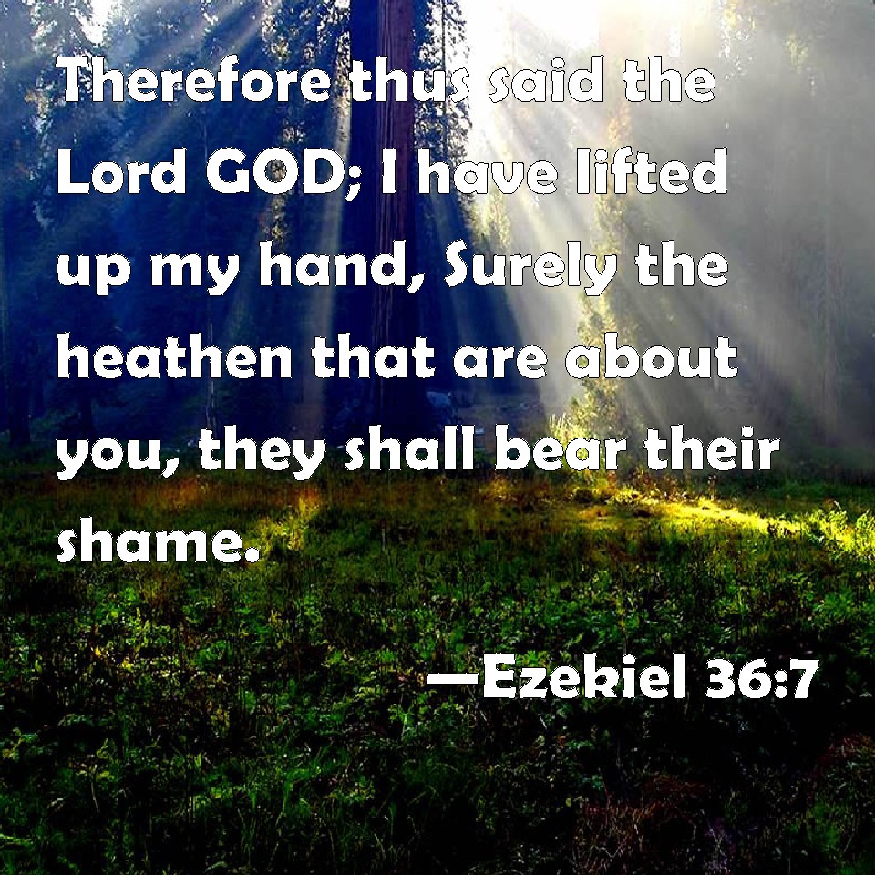 Choose a Background Ezekiel 36:7 Therefore thus said the Lord GOD; I have lifted up my hand, Surely the heathen that are about you, they shall bear their shame. KJV: Therefore thus saith the Lord GOD; I have lifted up mine hand, Surely the heathen that are about you, they shall bear their shame. DRB: Therefore thus saith the Lord God: I have lifted up my hand, that the Gentiles who are round about you, shall themselves bear their shame. DBT: therefore thus saith the Lord Jehovah: I have lifted up my hand, saying, Verily the nations that are about you, they shall bear their shame. ERV: therefore thus saith the Lord GOD: I have lifted up mine hand, saying, Surely the heathen that are round about you, they shall bear their shame. WBT: Therefore thus saith the Lord GOD; I have lifted up my hand, Surely the heathen that are about you, they shall bear their shame. WEB: therefore thus says the Lord Yahweh: I have sworn, [saying], Surely the nations that are around you, they shall bear their shame. YLT: Therefore, thus said the Lord Jehovah: I — I have lifted up My hand, Do not — the nations who are with you from round about — they their own shame bear?Links Ezekiel 36:7 NIV • Ezekiel 36:7 NLT • Ezekiel 36:7 ESV • Ezekiel 36:7 NASB • Ezekiel 36:7 KJV • Ezekiel 36:7 Interlinear • Ezekiel 36:7 Commentaries • Ezekiel 36:7 Parallel Texts • Ezekiel 36:7 Bible Apps • Ezekiel 36:7 Parallel • Bible Hub |