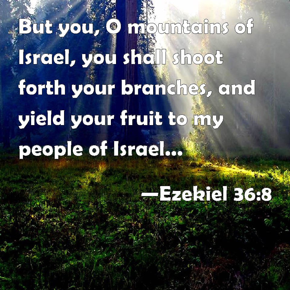 Choose a Background Ezekiel 36:8 But you, O mountains of Israel, you shall shoot forth your branches, and yield your fruit to my people of Israel; for they are at hand to come. KJV: But ye, O mountains of Israel, ye shall shoot forth your branches, and yield your fruit to my people of Israel; for they are at hand to come. DRB: But as for you, O mountains of Israel, shoot ye forth your branches, and yield your fruit to my people of Israel: for they are at hand to come. DBT: And ye mountains of Israel shall shoot forth your branches, and yield your fruit to my people Israel: for they are at hand to come. ERV: But ye, O mountains of Israel, ye shall shoot forth your branches, and yield your fruit to my people Israel; for they are at hand to come. WBT: But ye, O mountains of Israel, ye shall shoot forth your branches, and yield your fruit to my people of Israel; for they are at hand to come. WEB: But you, mountains of Israel, you shall shoot forth your branches, and yield your fruit to my people Israel; for they are at hand to come. YLT: And ye, O mountains of Israel, Your branch ye give out, and your fruits ye bear for My people Israel, For they have drawn near to come.Links Ezekiel 36:8 NIV • Ezekiel 36:8 NLT • Ezekiel 36:8 ESV • Ezekiel 36:8 NASB • Ezekiel 36:8 KJV • Ezekiel 36:8 Interlinear • Ezekiel 36:8 Commentaries • Ezekiel 36:8 Parallel Texts • Ezekiel 36:8 Bible Apps • Ezekiel 36:8 Parallel • Bible Hub |