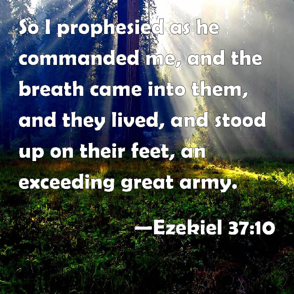 Choose a Background Ezekiel 37:10 So I prophesied as he commanded me, and the breath came into them, and they lived, and stood up on their feet, an exceeding great army. KJV: So I prophesied as he commanded me, and the breath came into them, and they lived, and stood up upon their feet, an exceeding great army. DRB: And I prophesied as he had commanded me: and the spirit came into them, and they lived: and they stood up upon their feet, an exceeding great army. DBT: And I prophesied as he had commanded me, and the breath came into them, and they lived, and stood up upon their feet, an exceeding great army. ERV: So I prophesied as he commanded me; and the breath came into them, and they lived, and stood up upon their feet, an exceeding great army. WBT: So I prophesied as he commanded me, and the breath came into them, and they lived, and stood up upon their feet, an exceeding great army. WEB: So I prophesied as he commanded me, and the breath came into them, and they lived, and stood up on their feet, an exceedingly great army. YLT: And I have prophesied as He commanded me, and the Spirit cometh into them, and they live, and stand on their feet — a very very great force.Links Ezekiel 37:10 NIV • Ezekiel 37:10 NLT • Ezekiel 37:10 ESV • Ezekiel 37:10 NASB • Ezekiel 37:10 KJV • Ezekiel 37:10 Interlinear • Ezekiel 37:10 Commentaries • Ezekiel 37:10 Parallel Texts • Ezekiel 37:10 Bible Apps • Ezekiel 37:10 Parallel • Bible Hub |