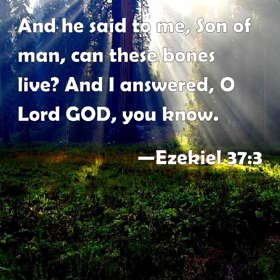 Choose a Background Ezekiel 37:3 And he said to me, Son of man, can these bones live? And I answered, O Lord GOD, you know. KJV: And he said unto me, Son of man, can these bones live? And I answered, O Lord GOD, thou knowest. DRB: And he said to me: Son of man, dost thou think these bones shall live? And I answered: O Lord God, thou knowest. DBT: And he said unto me, Son of man, Shall these bones live? And I said, Lord Jehovah, thou knowest. ERV: And he said unto me, Son of man, can these bones live? And I answered, O Lord GOD, thou knowest. WBT: And he said to me, Son of man, can these bones live? and I answered, O Lord GOD, thou knowest. WEB: He said to me, Son of man, can these bones live? I answered, Lord Yahweh, you know. YLT: And He saith unto me, 'Son of man, do these bones live?' And I say, 'O Lord Jehovah, Thou — Thou hast known.'Links Ezekiel 37:3 NIV • Ezekiel 37:3 NLT • Ezekiel 37:3 ESV • Ezekiel 37:3 NASB • Ezekiel 37:3 KJV • Ezekiel 37:3 Interlinear • Ezekiel 37:3 Commentaries • Ezekiel 37:3 Parallel Texts • Ezekiel 37:3 Bible Apps • Ezekiel 37:3 Parallel • Bible Hub |