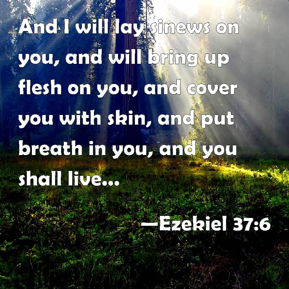 Choose a Background Ezekiel 37:6 And I will lay sinews on you, and will bring up flesh on you, and cover you with skin, and put breath in you, and you shall live; and you shall know that I am the LORD. KJV: And I will lay sinews upon you, and will bring up flesh upon you, and cover you with skin, and put breath in you, and ye shall live; and ye shall know that I am the LORD. DRB: And I will lay sinews upon you, and will cause flesh to grow over you, and will cover you with skin: and I will give you spirit and you shall live, and you shall know that I am the Lord. DBT: And I will put sinews upon you, and will bring up flesh upon you, and cover you with skin, and put breath in you, and ye shall live: and ye shall know that I am Jehovah. ERV: And I will lay sinews upon you, and will bring up flesh upon you, and cover you with skin, and put breath in you, and ye shall live; and ye shall know that I am the LORD. WBT: And I will lay sinews upon you, and will bring up flesh upon you, and cover you with skin, and put breath in you, and ye shall live; and ye shall know that I am the LORD. WEB: I will lay sinews on you, and will bring up flesh on you, and cover you with skin, and put breath in you, and you shall live; and you shall know that I am Yahweh. YLT: and I have given on you sinews, and cause flesh to come up upon you, and covered you over with skin, and given in you a spirit, and ye have lived, and ye have known that I am Jehovah.'Links Ezekiel 37:6 NIV • Ezekiel 37:6 NLT • Ezekiel 37:6 ESV • Ezekiel 37:6 NASB • Ezekiel 37:6 KJV • Ezekiel 37:6 Interlinear • Ezekiel 37:6 Commentaries • Ezekiel 37:6 Parallel Texts • Ezekiel 37:6 Bible Apps • Ezekiel 37:6 Parallel • Bible Hub |