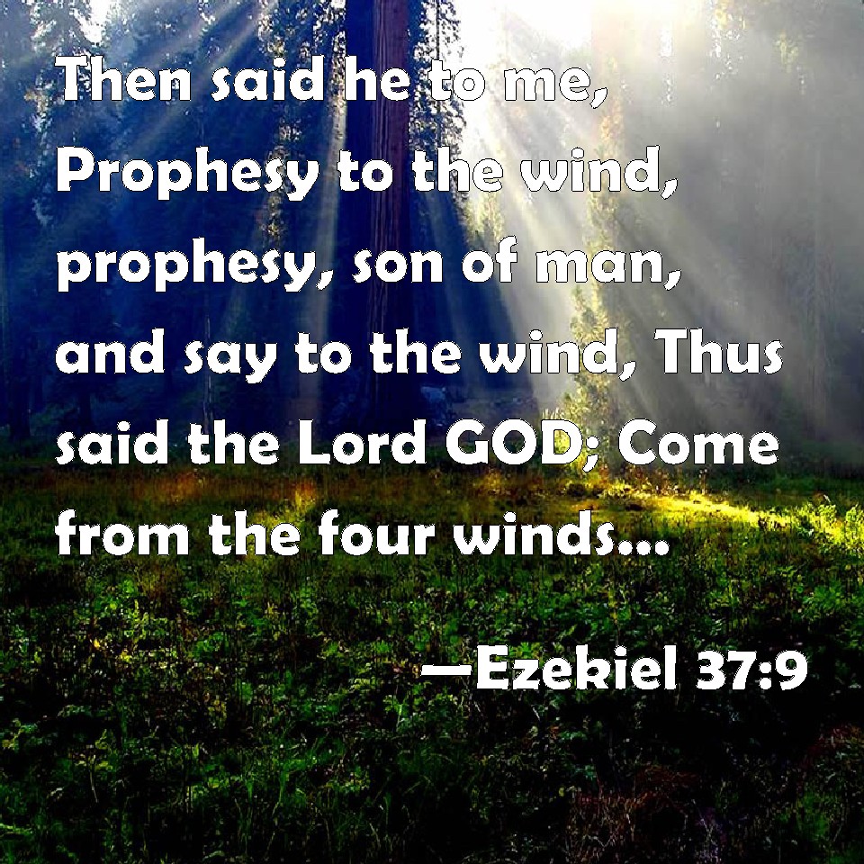 Choose a Background Ezekiel 37:9 Then said he to me, Prophesy to the wind, prophesy, son of man, and say to the wind, Thus said the Lord GOD; Come from the four winds, O breath, and breathe on these slain, that they may live. KJV: Then said he unto me, Prophesy unto the wind, prophesy, son of man, and say to the wind, Thus saith the Lord GOD; Come from the four winds, O breath, and breathe upon these slain, that they may live. DRB: And he said to me: Prophesy to the spirit, prophesy, O son of man, and say to the spirit: Thus saith the Lord God: Come, spirit, from the four winds, and blow upon these slain, and let them live again. DBT: And he said unto me, Prophesy unto the wind, prophesy, son of man, and say to the wind, Thus saith the Lord Jehovah: Come from the four winds, O breath, and breathe upon these slain, that they may live. ERV: Then said he unto me, Prophesy unto the wind, prophesy, son of man, and say to the wind, Thus saith the Lord GOD: Come from the four winds, O breath, and breathe upon these slain, that they may live. WBT: Then said he to me, Prophesy to the wind, prophesy, son of man, and say to the wind, Thus saith the Lord GOD; Come from the four winds, O breath, and breathe upon these slain, that they may live. WEB: Then he said to me, Prophesy to the wind, prophesy, son of man, and tell the wind, Thus says the Lord Yahweh: Come from the four winds, breath, and breathe on these slain, that they may live. YLT: And He saith unto me: 'Prophesy unto the Spirit, prophesy, son of man, and thou hast said unto the Spirit: Thus said the Lord Jehovah: From the four winds come in, O Spirit, and breathe on these slain, and they do live.'Links Ezekiel 37:9 NIV • Ezekiel 37:9 NLT • Ezekiel 37:9 ESV • Ezekiel 37:9 NASB • Ezekiel 37:9 KJV • Ezekiel 37:9 Interlinear • Ezekiel 37:9 Commentaries • Ezekiel 37:9 Parallel Texts • Ezekiel 37:9 Bible Apps • Ezekiel 37:9 Parallel • Bible Hub |