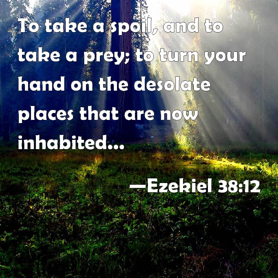 Choose a Background Ezekiel 38:12 To take a spoil, and to take a prey; to turn your hand on the desolate places that are now inhabited, and on the people that are gathered out of the nations, which have gotten cattle and goods, that dwell in the middle of the land. KJV: To take a spoil, and to take a prey; to turn thine hand upon the desolate places that are now inhabited, and upon the people that are gathered out of the nations, which have gotten cattle and goods, that dwell in the midst of the land. DRB: To take spoils, and lay hold on the prey, to lay thy hand upon them that had been wasted, and afterwards restored, and upon the people that is gathered together out of the nations, which hath begun to possess and to dwell in the midst of the earth. DBT: to seize a spoil, and to take a prey; to turn thy hand against the waste places that are now inhabited, and against a people gathered out of the nations, which have gotten cattle and goods, that dwell in the middle of the land. ERV: to take the spoil and to take the prey; to turn thine hand against the waste places that are now inhabited, and against the people that are gathered out of the nations, which have gotten cattle and goods, that dwell in the middle of the earth. WBT: To take a spoil, and to take a prey; to turn thy hand upon the desolate places that are now inhabited, and upon the people that are gathered out of the nations, which have gotten cattle and goods, that dwell in the midst of the land. WEB: to take the spoil and to take the prey; to turn your hand against the waste places that are [now] inhabited, and against the people who are gathered out of the nations, who have gotten livestock and goods, who dwell in the middle of the earth. YLT: To take a spoil, and to take a prey, To turn back thy hand on inhabited wastes, And on a people gathered out of nations, Making cattle and substance, Dwelling on a high part of the land.Links Ezekiel 38:12 NIV • Ezekiel 38:12 NLT • Ezekiel 38:12 ESV • Ezekiel 38:12 NASB • Ezekiel 38:12 KJV • Ezekiel 38:12 Interlinear • Ezekiel 38:12 Commentaries • Ezekiel 38:12 Parallel Texts • Ezekiel 38:12 Bible Apps • Ezekiel 38:12 Parallel • Bible Hub |