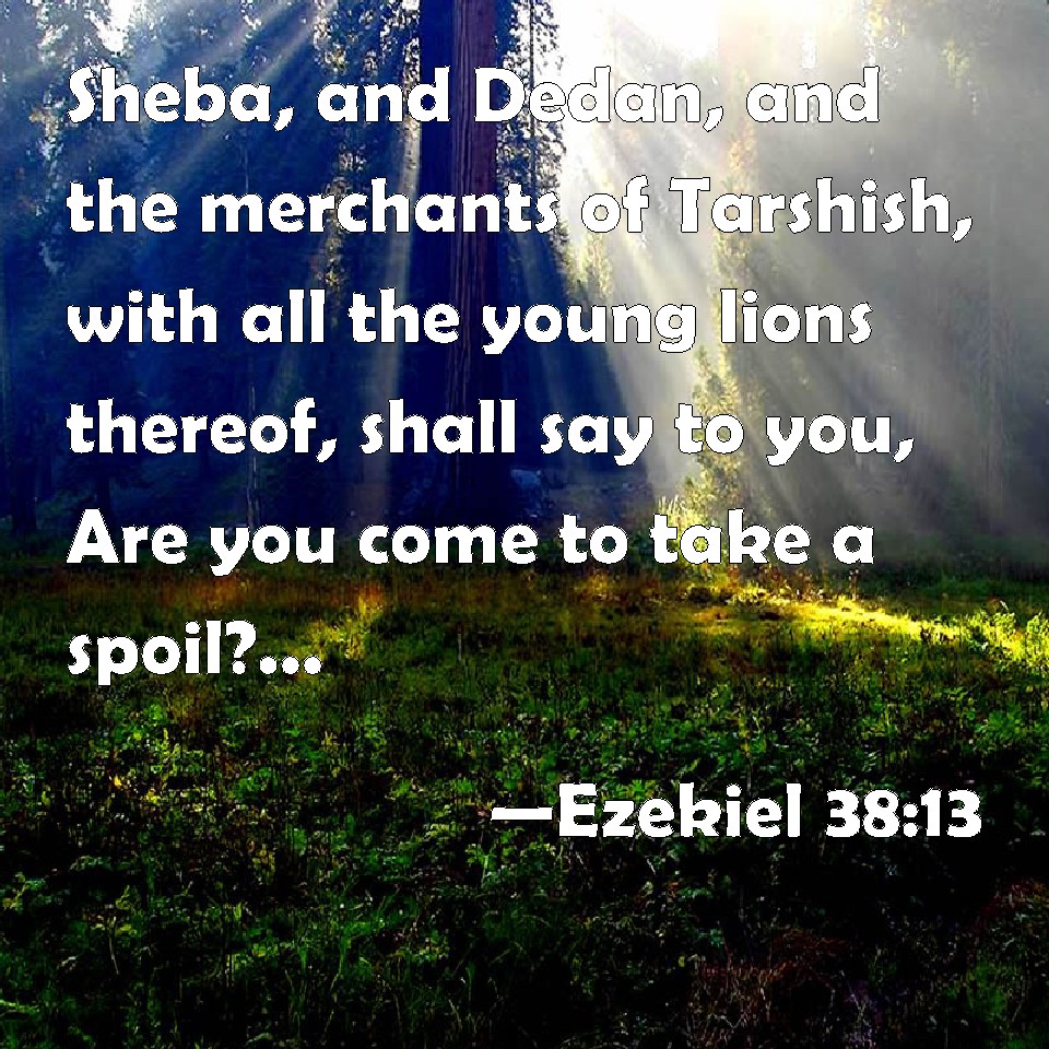 Choose a Background Ezekiel 38:13 Sheba, and Dedan, and the merchants of Tarshish, with all the young lions thereof, shall say to you, Are you come to take a spoil? have you gathered your company to take a prey? to carry away silver and gold, to take away cattle and goods, to take a great spoil? KJV: Sheba, and Dedan, and the merchants of Tarshish, with all the young lions thereof, shall say unto thee, Art thou come to take a spoil? hast thou gathered thy company to take a prey? to carry away silver and gold, to take away cattle and goods, to take a great spoil? DRB: Saba, and Dedan, and the merchants of Tharsis, and all the lions thereof shall say to thee: Art thou come to take spoils? behold, thou hast gathered thy multitude to take a prey, to take silver, and gold, and to carry away goods and substance, and to take rich spoils. DBT: Sheba, and Dedan, and the merchants of Tarshish, with all the young lions thereof, shall say unto thee, Art thou come to seize a spoil? hast thou gathered thine assemblage to take a prey? to carry away silver and gold, to take cattle and goods, to seize a great spoil? ERV: Sheba, and Dedan, and the merchants of Tarshish; with all the young lions thereof, shall say unto thee, Art thou come to take the spoil? hast thou assembled thy company to take the prey? to carry away silver and gold, to take away cattle and goods, to take great spoil? WBT: Sheba, and Dedan, and the merchants of Tarshish, with all its young lions, shall say to thee, Art thou come to take a spoil? hast thou gathered thy company to take a prey? to carry away silver and gold, to take away cattle and goods, to take a great spoil? WEB: Sheba, and Dedan, and the merchants of Tarshish, with all the young lions of it, shall tell you, Have you come to take the spoil? have you assembled your company to take the prey? to carry away silver and gold, to take away livestock and goods, to take great spoil? YLT: Sheba, and Dedan, and merchants of Tarshish, And all its young lions say to thee: To take a spoil art thou come in? To take a prey assembled thine assembly? To bear away silver and gold? To take away cattle and substance? To take a great spoil?Links Ezekiel 38:13 NIV • Ezekiel 38:13 NLT • Ezekiel 38:13 ESV • Ezekiel 38:13 NASB • Ezekiel 38:13 KJV • Ezekiel 38:13 Interlinear • Ezekiel 38:13 Commentaries • Ezekiel 38:13 Parallel Texts • Ezekiel 38:13 Bible Apps • Ezekiel 38:13 Parallel • Bible Hub |