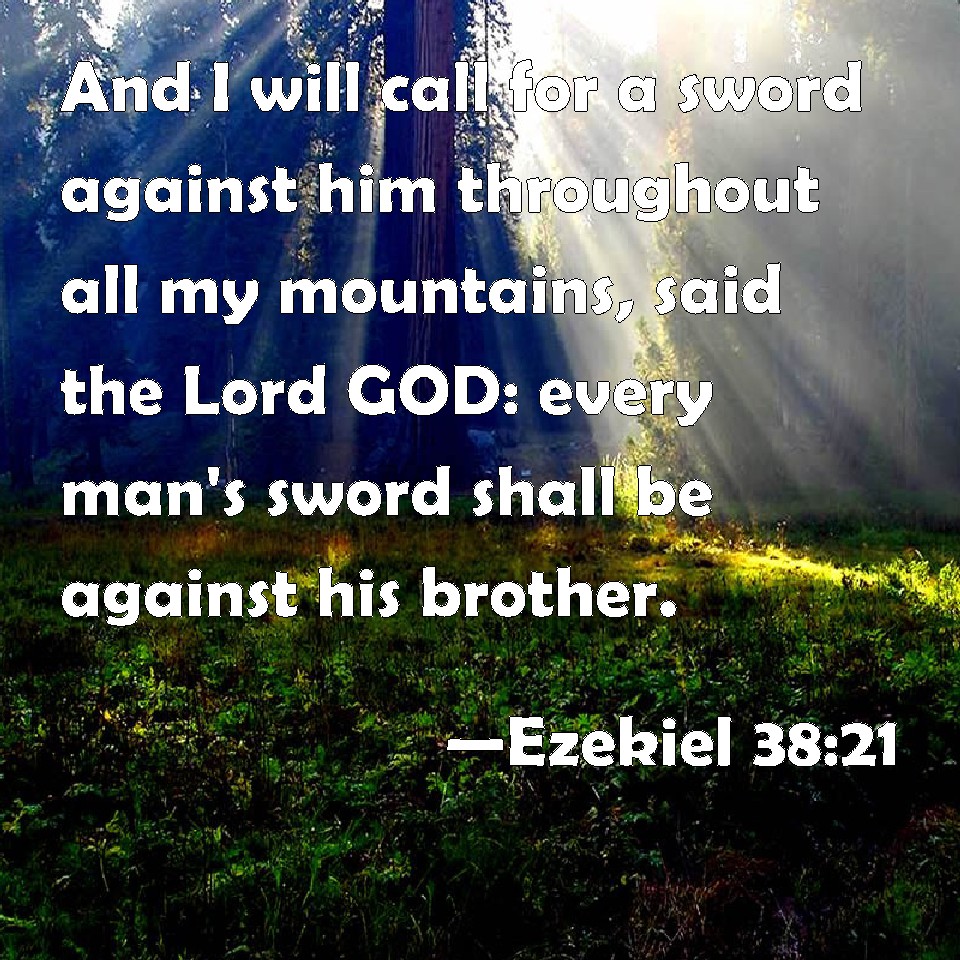 Choose a Background Ezekiel 38:21 And I will call for a sword against him throughout all my mountains, said the Lord GOD: every man's sword shall be against his brother. KJV: And I will call for a sword against him throughout all my mountains, saith the Lord GOD: every man's sword shall be against his brother. DRB: And I will call in the sword against him in all my mountains, saith the Lord God: every man's sword shall be pointed against his brother. DBT: And I will call for a sword against him throughout all my mountains, saith the Lord Jehovah: every man's sword shall be against his brother. ERV: And I will call for a sword against him unto all my mountains, saith the Lord GOD: every man's sword shall be against his brother. WBT: And I will call for a sword against him throughout all my mountains, saith the Lord GOD: every man's sword shall be against his brother. WEB: I will call for a sword against him to all my mountains, says the Lord Yahweh: every man's sword shall be against his brother. YLT: And I have called against him, to all My mountains a sword, An affirmation of the Lord Jehovah, The sword of each is against his brother.Links Ezekiel 38:21 NIV • Ezekiel 38:21 NLT • Ezekiel 38:21 ESV • Ezekiel 38:21 NASB • Ezekiel 38:21 KJV • Ezekiel 38:21 Interlinear • Ezekiel 38:21 Commentaries • Ezekiel 38:21 Parallel Texts • Ezekiel 38:21 Bible Apps • Ezekiel 38:21 Parallel • Bible Hub |