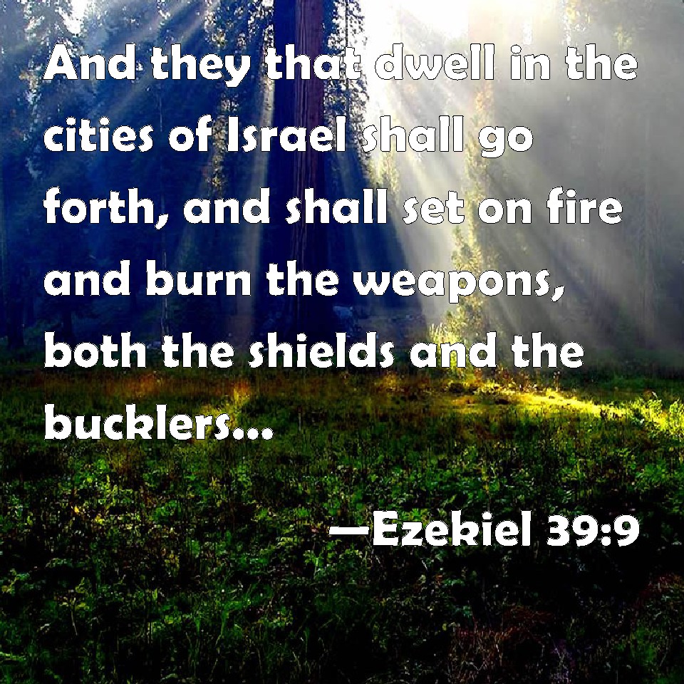 Choose a Background Ezekiel 39:9 And they that dwell in the cities of Israel shall go forth, and shall set on fire and burn the weapons, both the shields and the bucklers, the bows and the arrows, and the hand staves, and the spears, and they shall burn them with fire seven years: KJV: And they that dwell in the cities of Israel shall go forth, and shall set on fire and burn the weapons, both the shields and the bucklers, the bows and the arrows, and the handstaves, and the spears, and they shall burn them with fire seven years: DRB: And the inhabitants shall go forth of the cities of Israel, and shall set on fire and burn the weapons, the shields, and the spears, the bows and the arrows, and the handstaves and the pikes: and they shall burn them with fire seven years. DBT: And they that dwell in the cities of Israel shall go forth, and shall kindle fire, and burn weapons, and shields, and targets, bows, and arrows, and hand-staves, and spears: and they shall make fires with them seven years. ERV: And they that dwell in the cities of Israel shall go forth, and shall make fires of the weapons and burn them, both the shields and the bucklers, the bows and the arrows, and the handstaves, and the spears, and they shall make fires of them seven years. WBT: And they that dwell in the cities of Israel shall go forth, and shall set on fire and burn the weapons, both the shields and the bucklers, the bows and the arrows, and the handstaffs, and the spears, and they shall burn them with fire seven years: WEB: Those who dwell in the cities of Israel shall go forth, and shall make fires of the weapons and burn them, both the shields and the bucklers, the bows and the arrows, and the war clubs, and the spears, and they shall make fires of them seven years; YLT: And gone out have the inhabitants of cities of Israel, And they have burned and kindled a fire, With armour, and shield, and buckler, With bow, and with arrows, And with hand-staves, and with javelins, And they have caused a fire to burn with them seven years,Links Ezekiel 39:9 NIV • Ezekiel 39:9 NLT • Ezekiel 39:9 ESV • Ezekiel 39:9 NASB • Ezekiel 39:9 KJV • Ezekiel 39:9 Interlinear • Ezekiel 39:9 Commentaries • Ezekiel 39:9 Parallel Texts • Ezekiel 39:9 Bible Apps • Ezekiel 39:9 Parallel • Bible Hub |