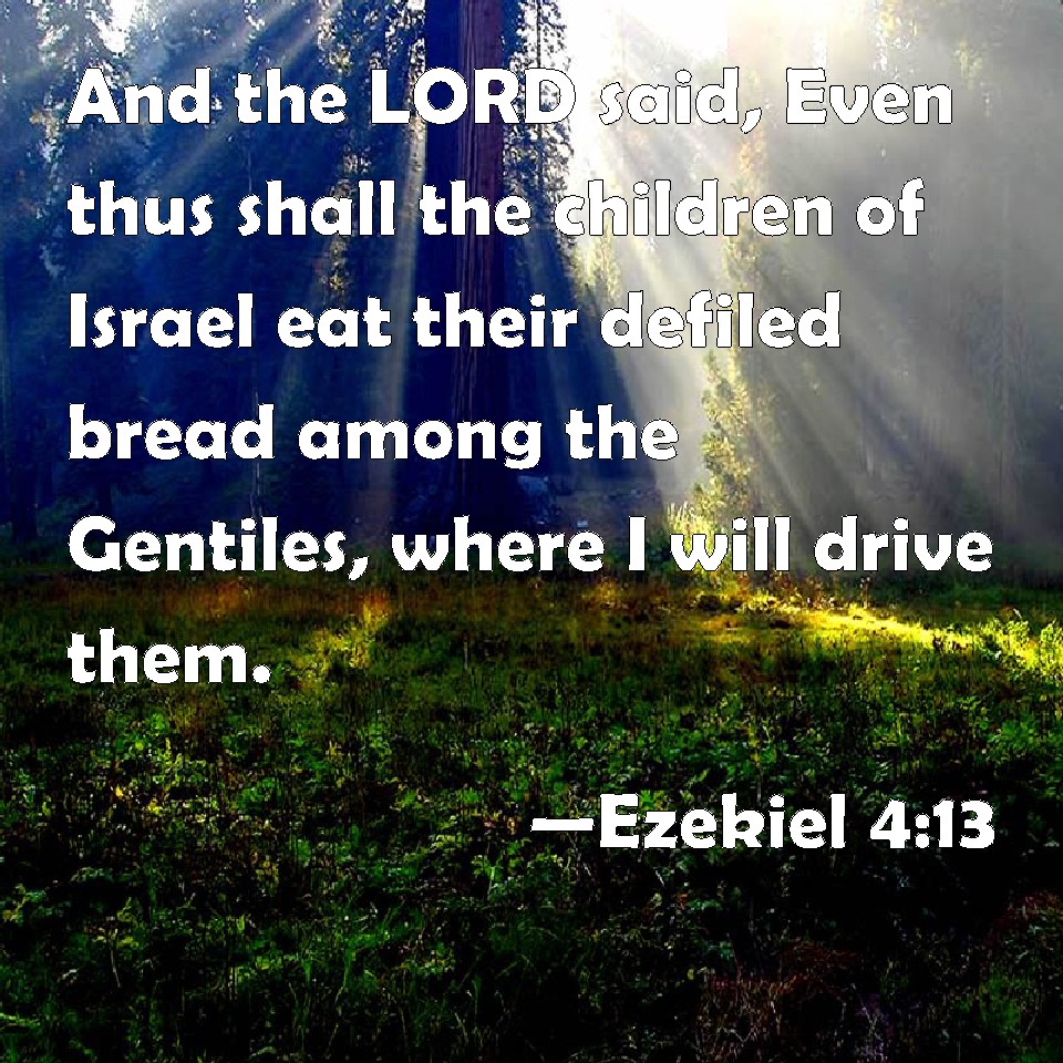 Choose a Background Ezekiel 4:13 And the LORD said, Even thus shall the children of Israel eat their defiled bread among the Gentiles, where I will drive them. KJV: And the LORD said, Even thus shall the children of Israel eat their defiled bread among the Gentiles, whither I will drive them. DRB: And the Lord said: So shall the children of Israel eat their bread all filthy among the nations whither I will cast them out. DBT: And Jehovah said, So shall the children of Israel eat their bread unclean among the nations whither I will drive them. ERV: And the LORD said, Even thus shall the children of Israel eat their bread unclean, among the nations whither I will drive them. WBT: And the LORD said, Even thus shall the children of Israel eat their defiled bread among the Gentiles, whither I will drive them. WEB: Yahweh said, Even thus shall the children of Israel eat their bread unclean, among the nations where I will drive them. YLT: And Jehovah saith, 'Thus do the sons of Israel eat their defiled bread among the nations whither I drive them.'Links Ezekiel 4:13 NIV • Ezekiel 4:13 NLT • Ezekiel 4:13 ESV • Ezekiel 4:13 NASB • Ezekiel 4:13 KJV • Ezekiel 4:13 Interlinear • Ezekiel 4:13 Commentaries • Ezekiel 4:13 Parallel Texts • Ezekiel 4:13 Bible Apps • Ezekiel 4:13 Parallel • Bible Hub |
