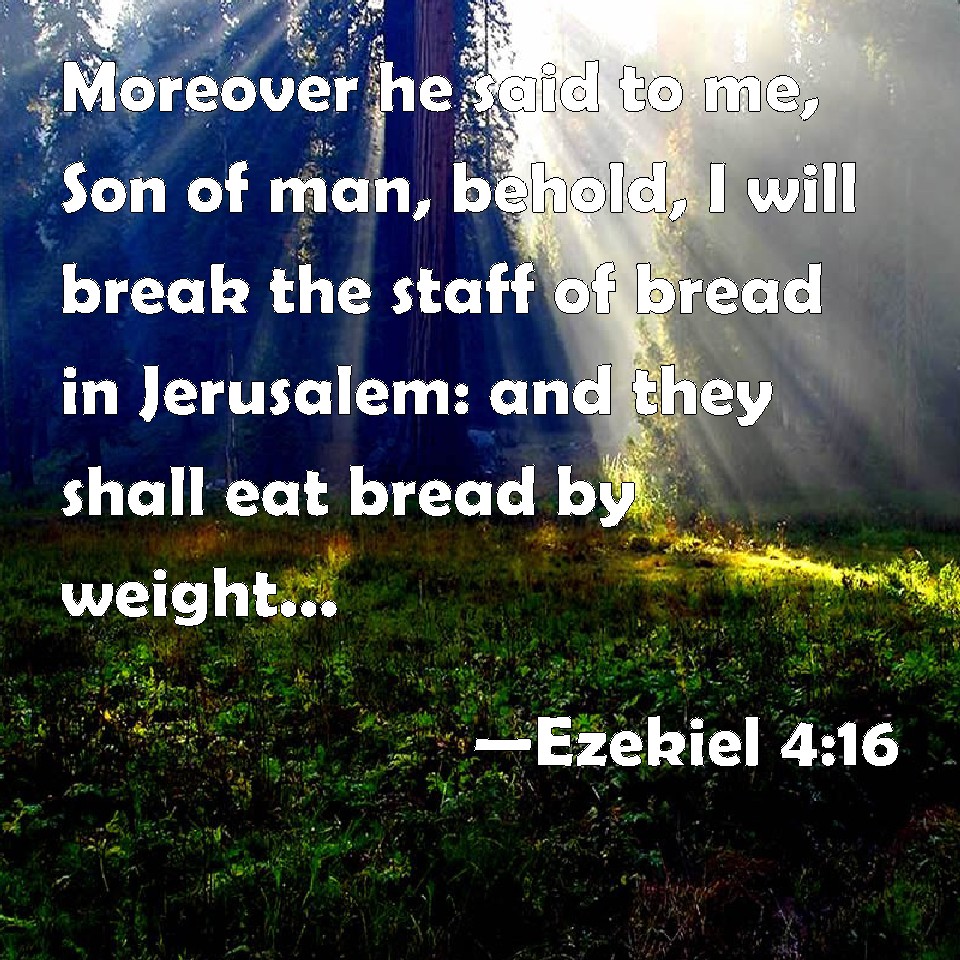 Ezekiel 4:16 Moreover he said to me, Son of man, behold, I will break the staff of bread in Jerusalem: and they shall eat bread by weight, and with care; and they shall drink water by measure, and with astonishment: