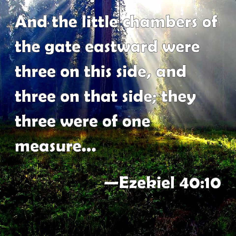 Choose a Background Ezekiel 40:10 And the little chambers of the gate eastward were three on this side, and three on that side; they three were of one measure: and the posts had one measure on this side and on that side. KJV: And the little chambers of the gate eastward were three on this side, and three on that side; they three were of one measure: and the posts had one measure on this side and on that side. DRB: And the little chambers of the gate that looked eastward were three on this side, and three on that side: all three were of one measure, and the fronts of one measure, on both parts. DBT: And the chambers of the gate which was toward the east were three on this side and three on that side: they three were of one measure; and the posts on this side and on that side had one measure. ERV: And the lodges of the gate eastward were three on this side, and three on that side; they three were of one measure: and the posts had one measure on this side and on that side. WBT: And the little chambers of the gate eastward were three on this side, and three on that side; they three were of one measure: and the posts had one measure on this side and on that side. WEB: The lodges of the gate eastward were three on this side, and three on that side; they three were of one measure: and the posts had one measure on this side and on that side. YLT: and the little chambers of the gate eastward, three on this side, and three on that side; one measure is to them three, and one measure is to the posts, on this side and on that side.Links Ezekiel 40:10 NIV • Ezekiel 40:10 NLT • Ezekiel 40:10 ESV • Ezekiel 40:10 NASB • Ezekiel 40:10 KJV • Ezekiel 40:10 Interlinear • Ezekiel 40:10 Commentaries • Ezekiel 40:10 Parallel Texts • Ezekiel 40:10 Bible Apps • Ezekiel 40:10 Parallel • Bible Hub |