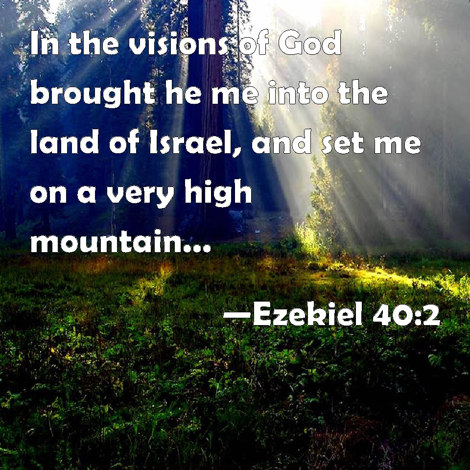 Choose a Background Ezekiel 40:2 In the visions of God brought he me into the land of Israel, and set me on a very high mountain, by which was as the frame of a city on the south. KJV: In the visions of God brought he me into the land of Israel, and set me upon a very high mountain, by which was as the frame of a city on the south. DRB: In the visions of God he brought me into the land of Israel, and set me upon a very high mountain: upon which there was as the building of a city, bending towards the south. DBT: In the visions of God brought he me into the land of Israel, and set me upon a very high mountain; and upon it was as the building of a city, on the south. ERV: In the visions of God brought he me into the land of Israel, and set me down upon a very high mountain, whereon was as it were the frame of a city on the south. WBT: In the visions of God he brought me into the land of Israel, and set me upon a very high mountain, by which was as the frame of a city on the south. WEB: In the visions of God brought he me into the land of Israel, and set me down on a very high mountain, whereon was as it were the frame of a city on the south. YLT: in visions of God He hath brought me in unto the land of Israel, and causeth me to rest on a very high mountain, and upon it is as the frame of a city on the south.Links Ezekiel 40:2 NIV • Ezekiel 40:2 NLT • Ezekiel 40:2 ESV • Ezekiel 40:2 NASB • Ezekiel 40:2 KJV • Ezekiel 40:2 Interlinear • Ezekiel 40:2 Commentaries • Ezekiel 40:2 Parallel Texts • Ezekiel 40:2 Bible Apps • Ezekiel 40:2 Parallel • Bible Hub |