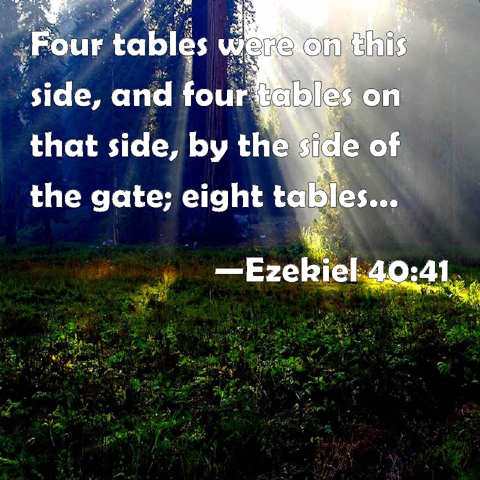 Choose a Background Ezekiel 40:41 Four tables were on this side, and four tables on that side, by the side of the gate; eight tables, whereupon they slew their sacrifices. KJV: Four tables were on this side, and four tables on that side, by the side of the gate; eight tables, whereupon they slew their sacrifices. DRB: Four tables were on this side, and four tables on that side: at the sides of the gate were eight tables, upon which they slew the victims. DBT: four tables on this side, and four tables on that side, by the side of the gate, eight tables, whereon they slew the sacrifice, ERV: Four tables were on this side, and four tables on that side, by the side of the gate; eight tables, whereupon they slew the sacrifices. WBT: Four tables were on this side, and four tables on that side, by the side of the gate; eight tables, upon which they slew their sacrifices. WEB: Four tables were on this side, and four tables on that side, by the side of the gate; eight tables, whereupon they killed [the sacrifices]. YLT: four tables are on this side, and four tables on that side, at the side of the gate, eight tables on which they slaughter.Links Ezekiel 40:41 NIV • Ezekiel 40:41 NLT • Ezekiel 40:41 ESV • Ezekiel 40:41 NASB • Ezekiel 40:41 KJV • Ezekiel 40:41 Interlinear • Ezekiel 40:41 Commentaries • Ezekiel 40:41 Parallel Texts • Ezekiel 40:41 Bible Apps • Ezekiel 40:41 Parallel • Bible Hub |