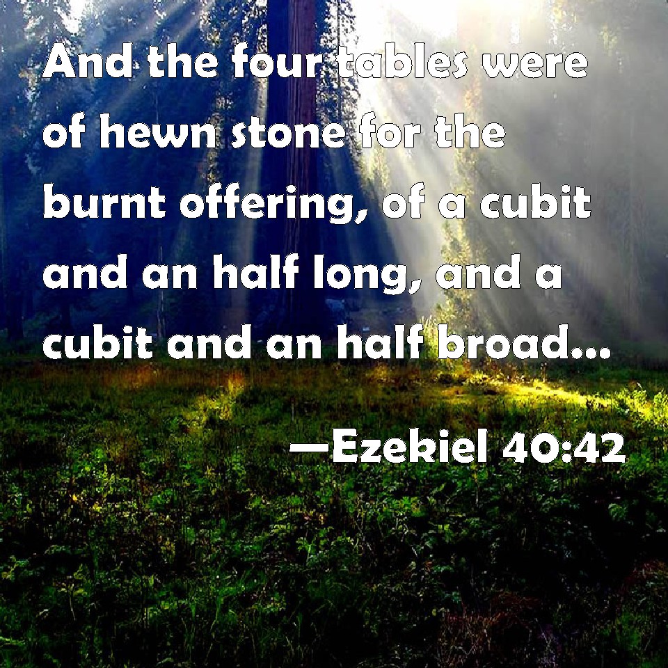 Choose a Background Ezekiel 40:42 And the four tables were of hewn stone for the burnt offering, of a cubit and an half long, and a cubit and an half broad, and one cubit high: whereupon also they laid the instruments with which they slew the burnt offering and the sacrifice. KJV: And the four tables were of hewn stone for the burnt offering, of a cubit and an half long, and a cubit and an half broad, and one cubit high: whereupon also they laid the instruments wherewith they slew the burnt offering and the sacrifice. DRB: And the four tables for the holocausts were made of square stones: one cubit and a half long, and one cubit and a half broad, and one cubit high: to lay the vessels upon, in which the holocaust and the victim is slain. DBT: and at the ascent, four tables of hewn stone, of a cubit and a half long, and a cubit and a half broad, and one cubit high; whereon also they laid the instruments with which they slew the burnt-offering and the sacrifice. ERV: And there were four tables for the burnt offering, of hewn stone, a cubit and an half long, and a cubit and an half broad, and one cubit high: whereupon they laid the instruments wherewith they slew the burnt offering and the sacrifice. WBT: And the four tables were of hewn stone for the burnt-offering, of a cubit and a half long, and a cubit and a half broad, and one cubit high: upon which also they laid the instruments with which they slew the burnt-offering and the sacrifice. WEB: There were four tables for the burnt offering, of cut stone, a cubit and a half long, and a cubit and a half broad, and one cubit high; whereupon they laid the instruments with which they killed the burnt offering and the sacrifice. YLT: And the four tables for burnt-offering are of hewn stone: the length one cubit and a half, and the breadth one cubit and a half, and the height one cubit: on them they place the instruments with which they slaughter the burnt-offering and the sacrifice.Links Ezekiel 40:42 NIV • Ezekiel 40:42 NLT • Ezekiel 40:42 ESV • Ezekiel 40:42 NASB • Ezekiel 40:42 KJV • Ezekiel 40:42 Interlinear • Ezekiel 40:42 Commentaries • Ezekiel 40:42 Parallel Texts • Ezekiel 40:42 Bible Apps • Ezekiel 40:42 Parallel • Bible Hub |